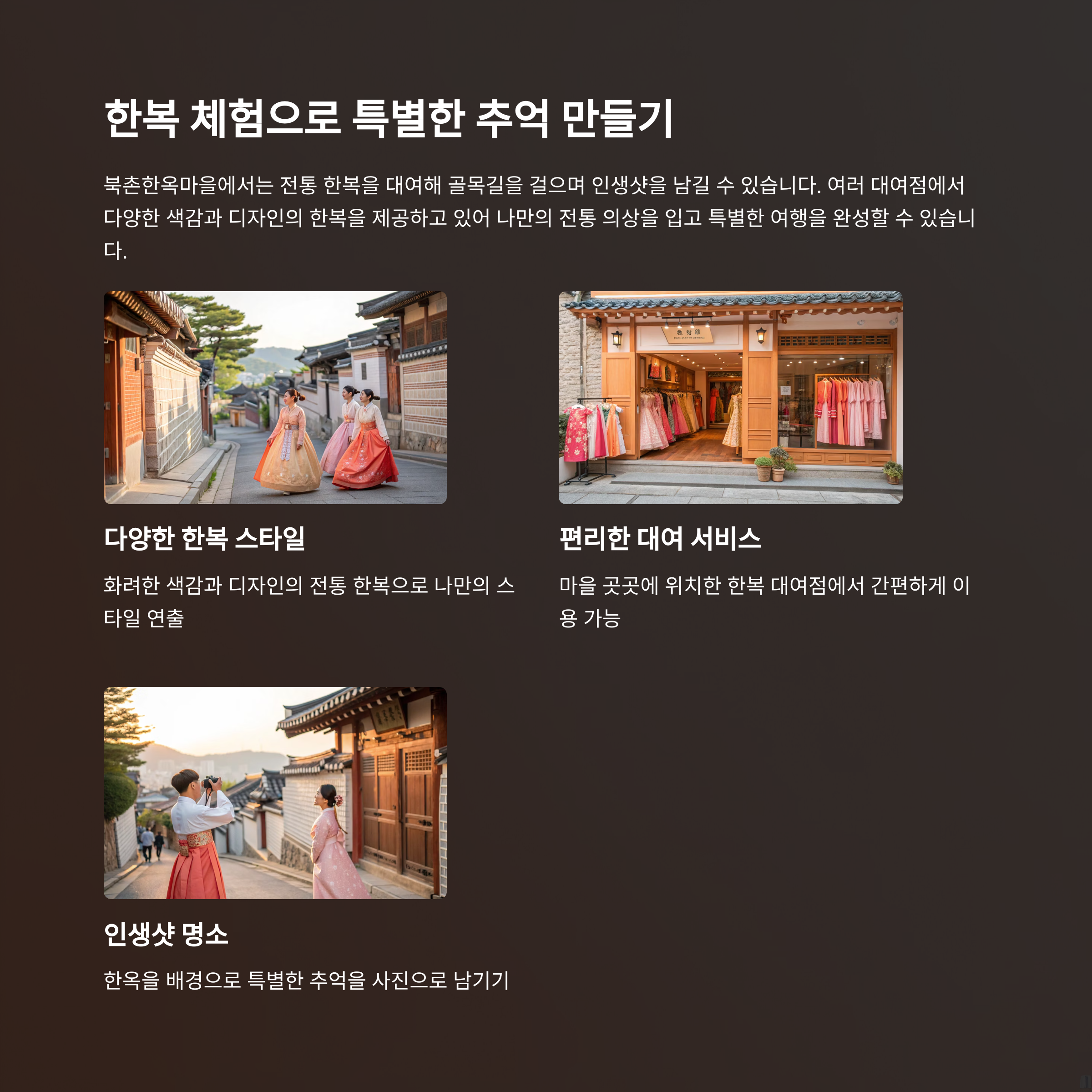 이곳은 한복 체험, 공방 체험, 전통 찻집 등 다양한 즐길 거리가 가득합니다.