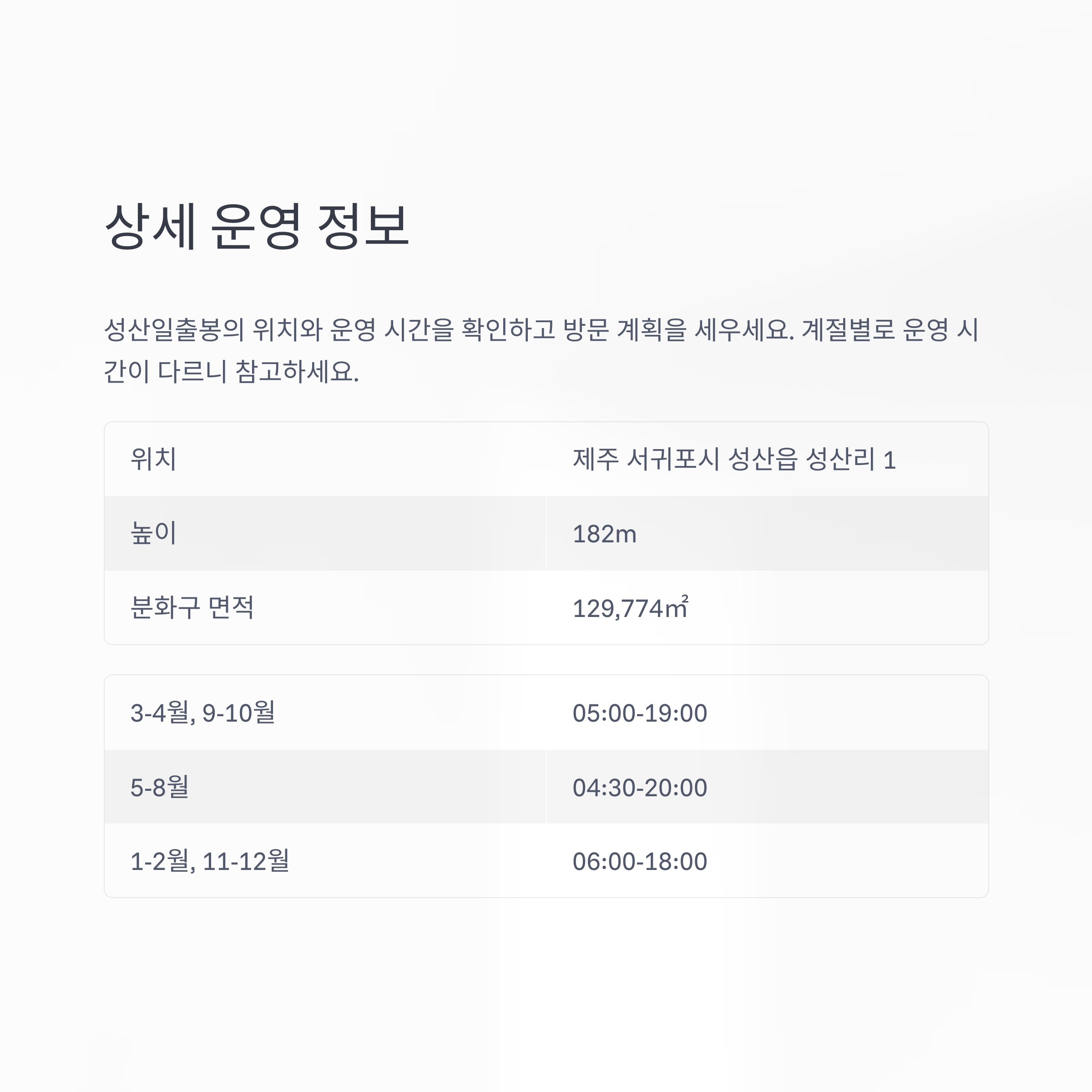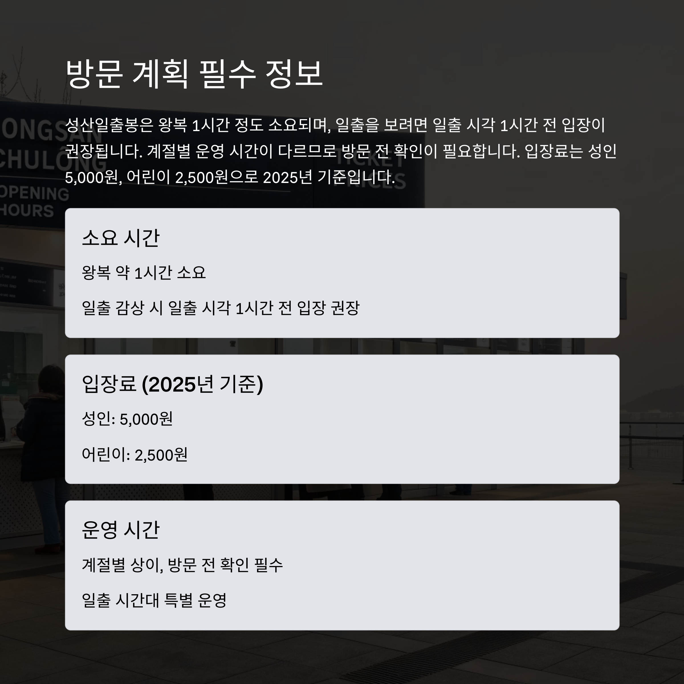 일출 시각 1시간 전 입장이 권장됩니다. 계절별 운영 시간이