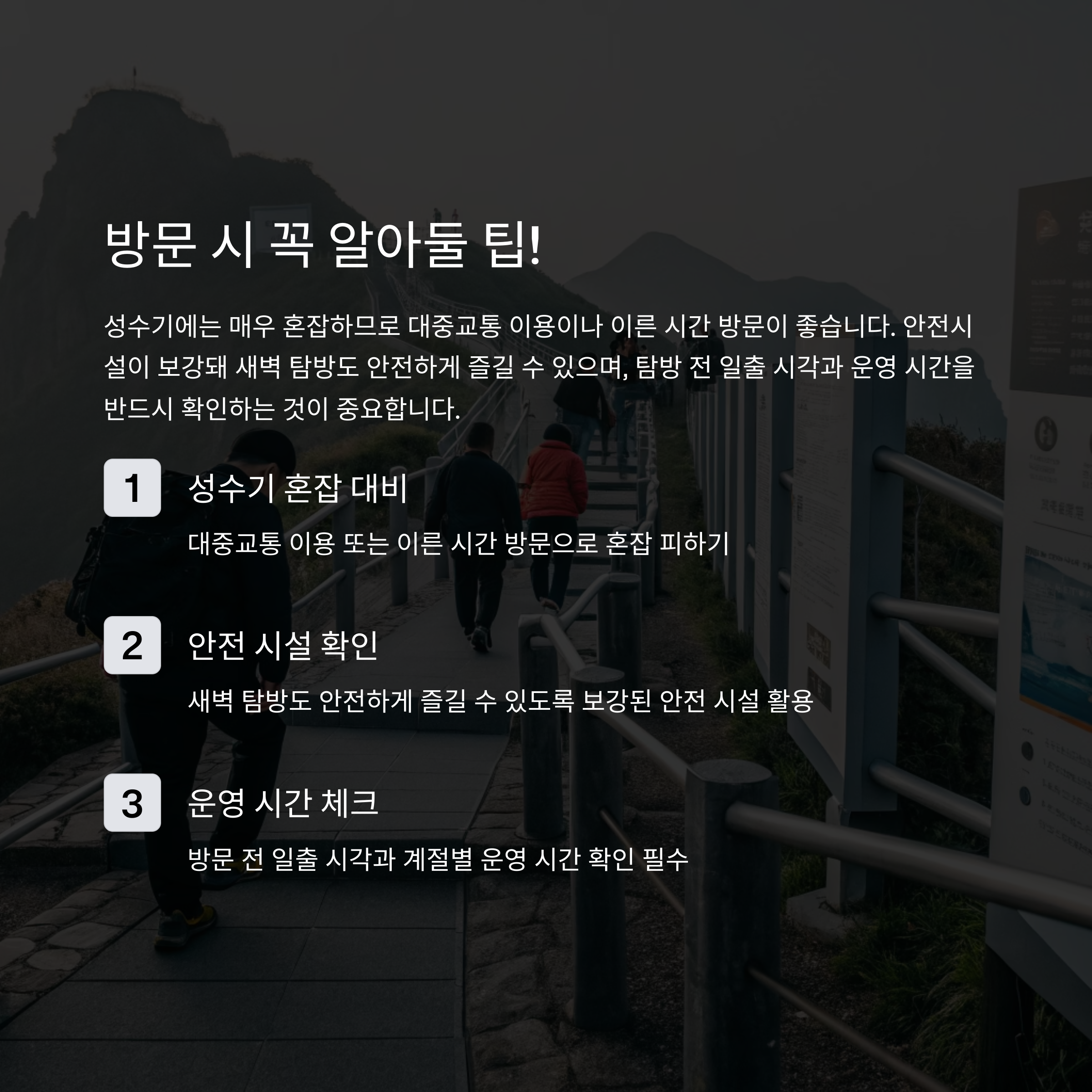 안전하게 즐길 수 있으며, 탐방 전 일출 시각과 운영