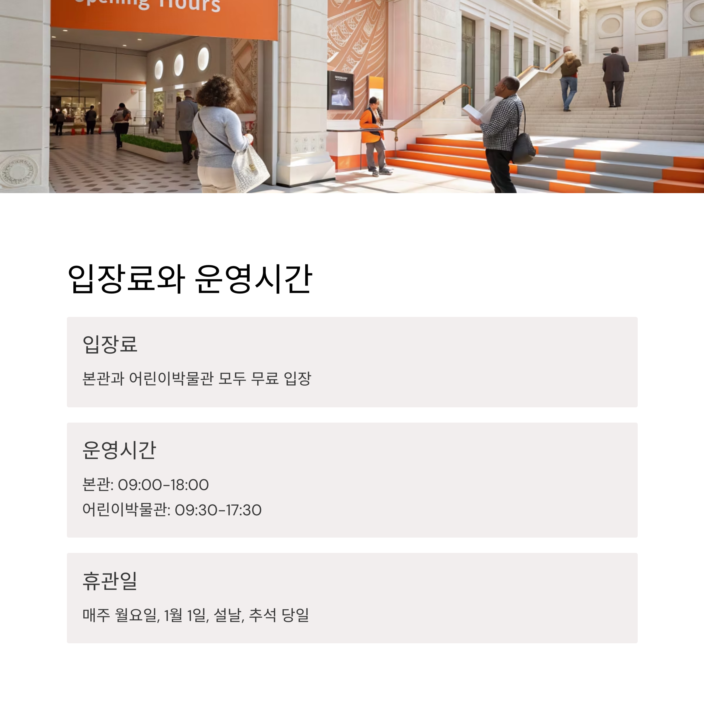 운영하며 매주 월요일, 1월 1일, 설날과 추석 당일은 휴관입니다.