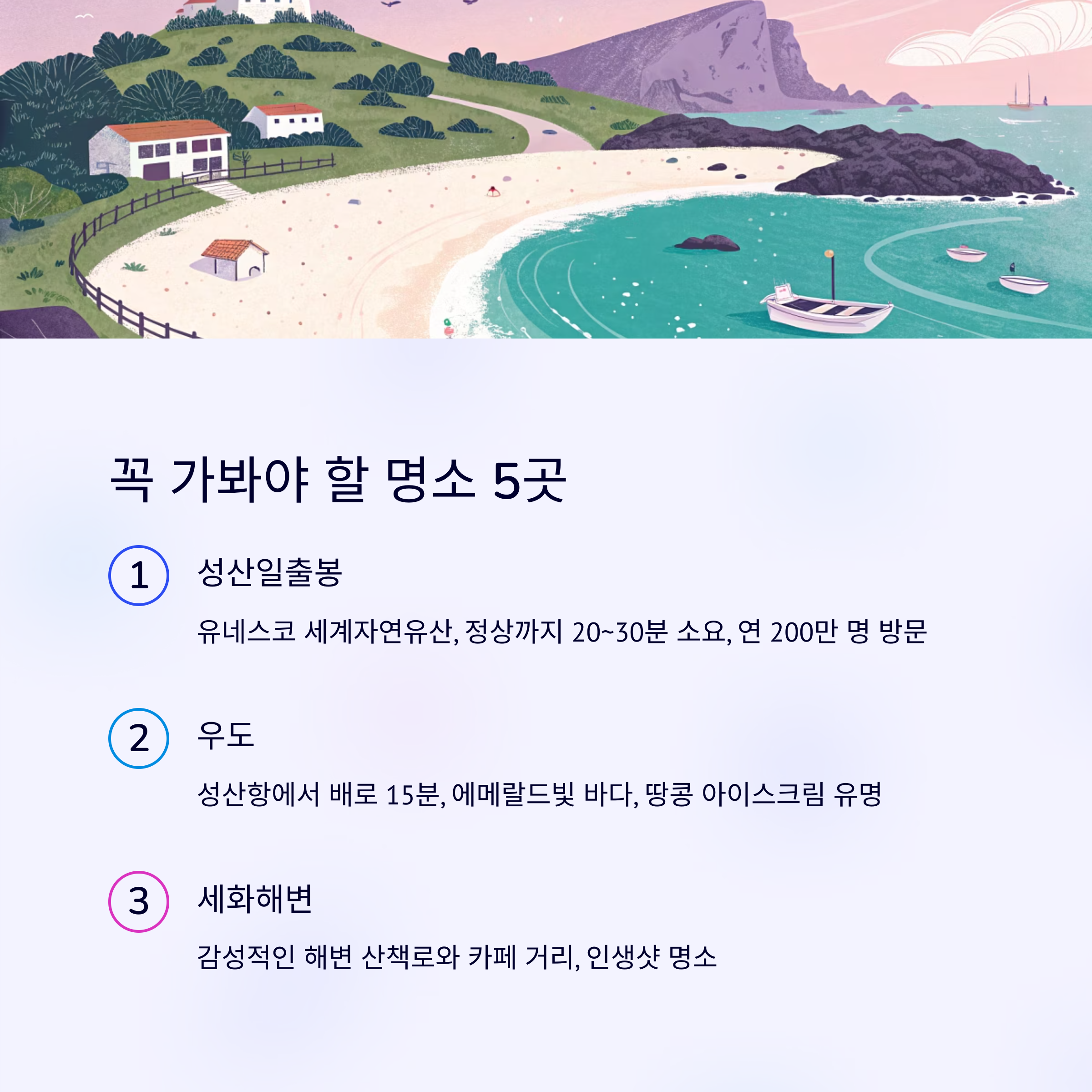 성산일출봉, 우도, 세화해변, 섭지코지, 혼인지 같은 명소와