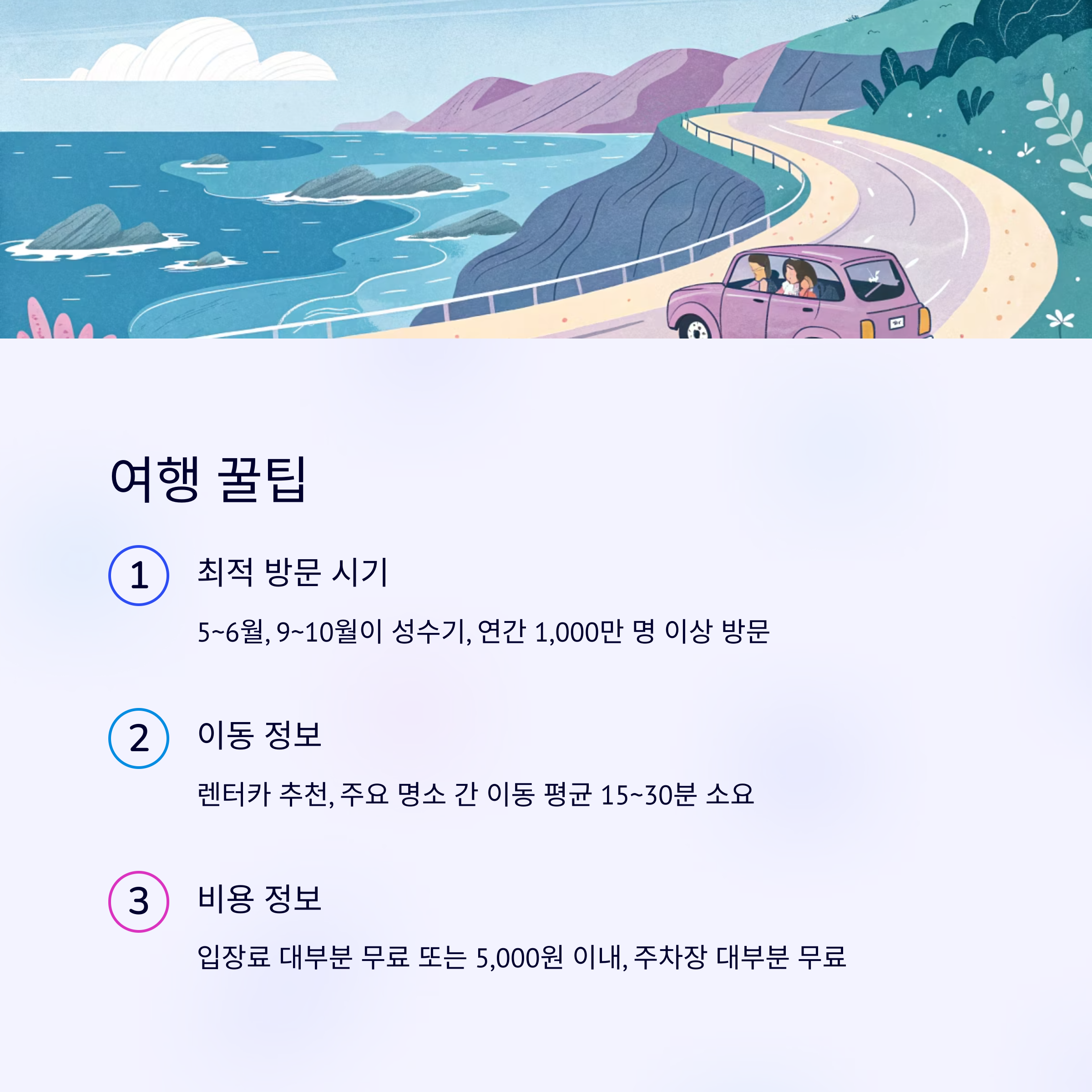 | 섭지코지 | 해안 산책로, 촬영지 | 90만 명 이상 |