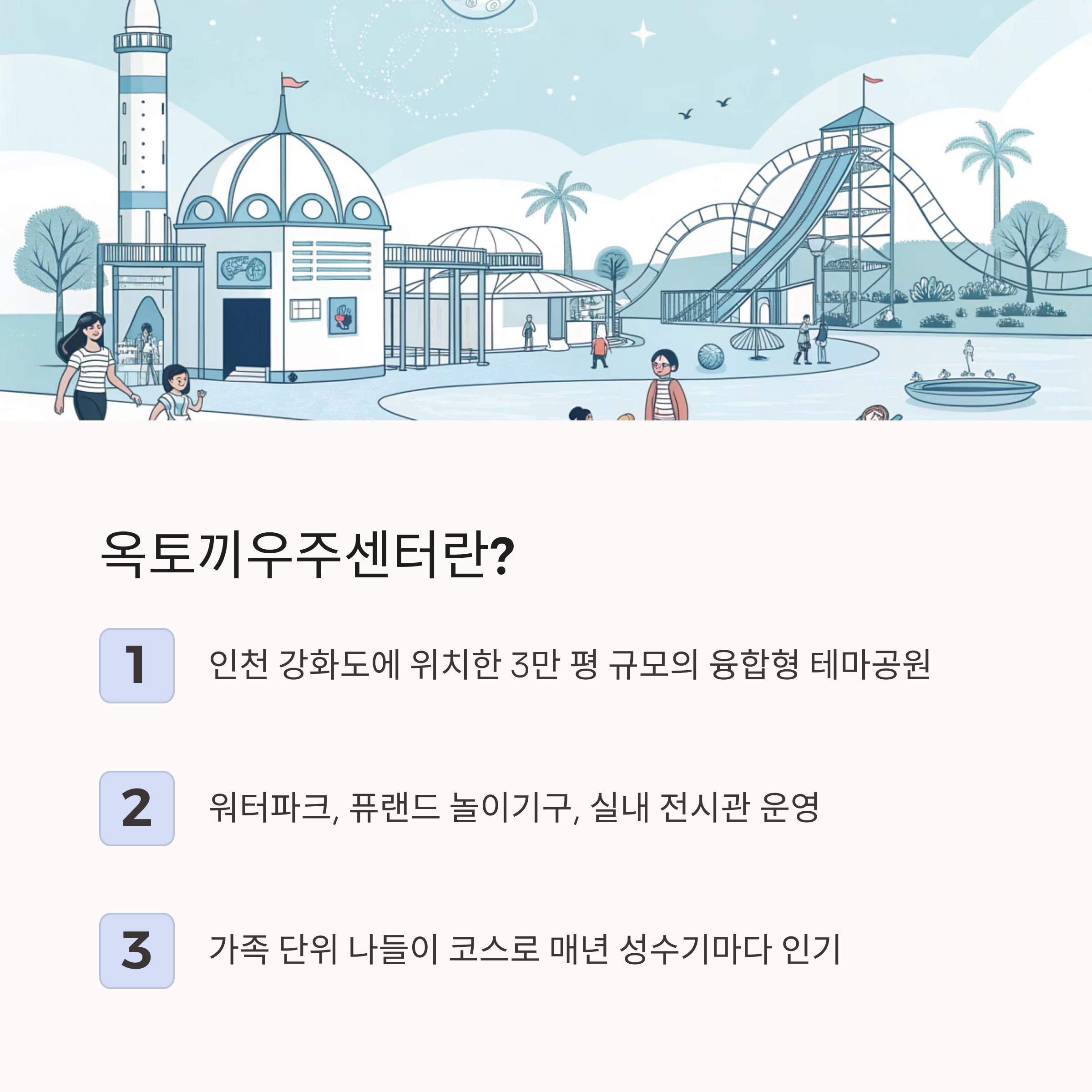 인천 강화도에 위치한 옥토끼우주센터는 워터파크, 슬라이드, 계절별 놀이기구, 그리고 우주과학 체험까지 가능한 복합 테마파크입니다. 특히 여름에는 야외 물놀이 시설이 활성화되며, 유아부터 초등학생, 성인까지 모두 즐길 수 있는 프로그램이 준비되어 있어 가족 단위 방문객들에게 큰 인기를 끌고 있습니다. 운영시간, 요금, 계절별 이벤트까지 꼼꼼하게 정리해드릴게요.