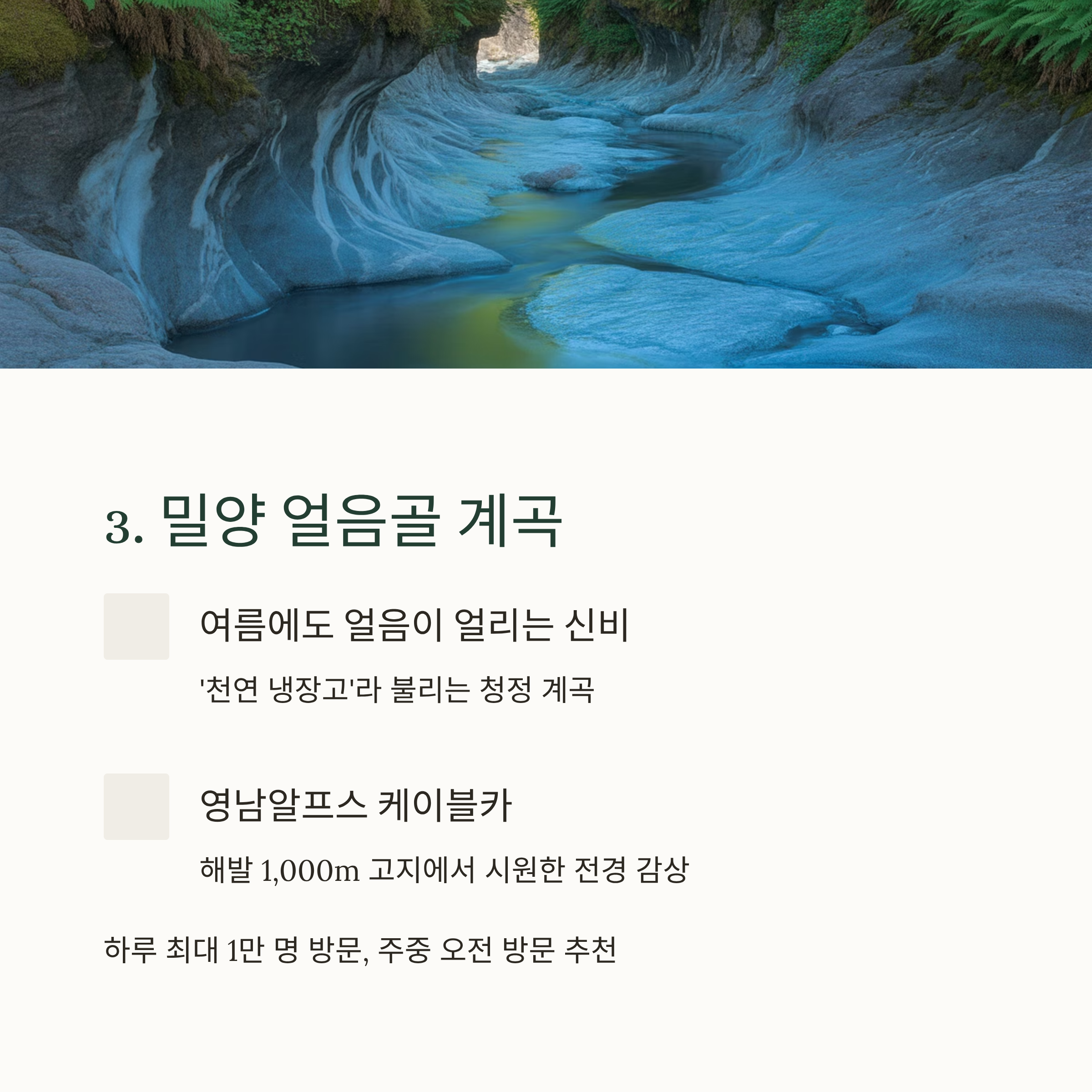 3. 밀양 얼음골 계곡 & 케이블카 – 한여름에도 서늘한 청정 계곡