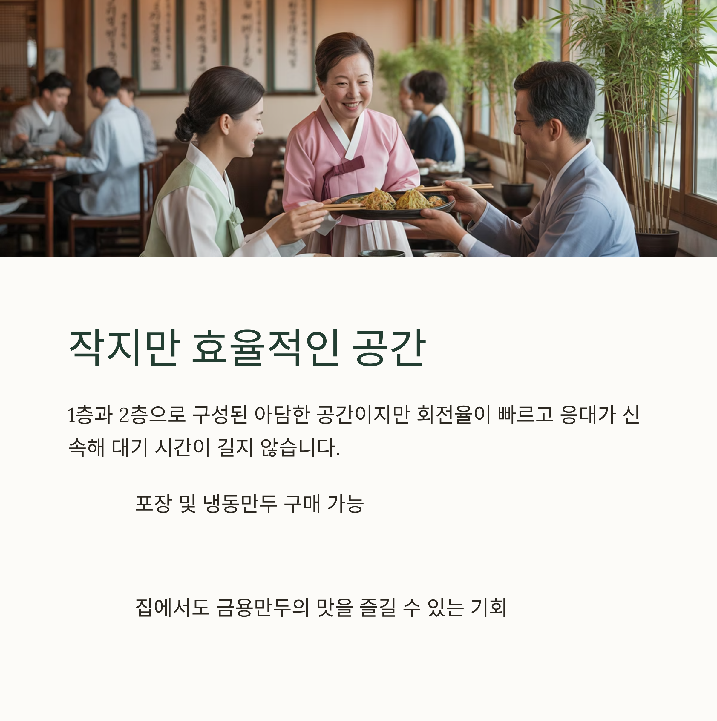 내부는 1층과 2층으로 구성되어 있지만 테이블 수가 많지는 않아 붐비는 시간에는 대기가 필요할 수 있습니다. 하지만 회전이 빠르고 응대도 신속해 큰 불편 없이 식사가 가능합니다. 포장 및 냉동만두 구매도 가능하여, 집에서 간편하게 만두를 즐기고자 하는 고객들에게도 좋은 선택이 됩니다.