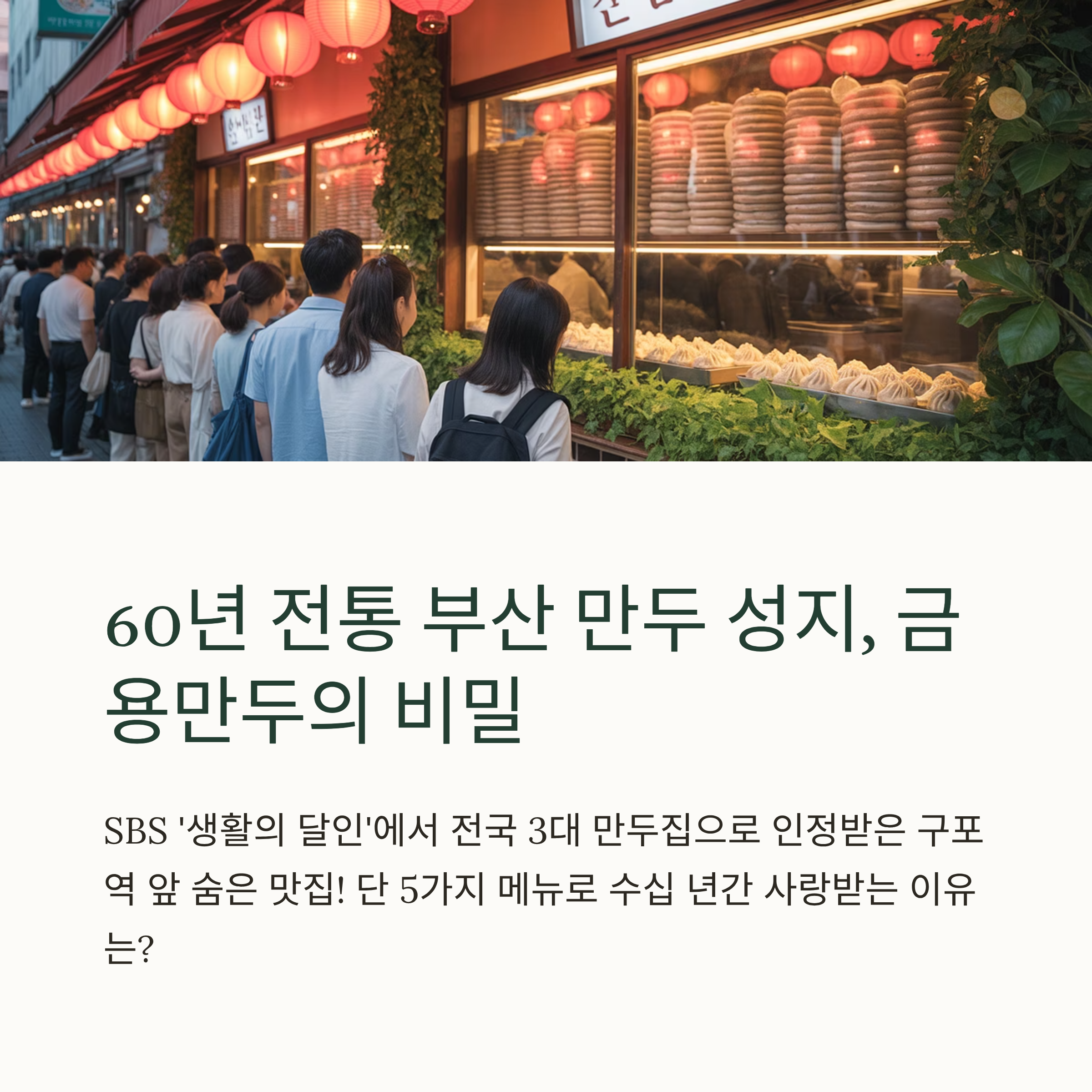 부산 북구 구포역 앞에 위치한 금용만두는 단순한 동네 만두집을 넘어, 진정한 전통의 맛집으로 손꼽히고 있습니다. 60년 넘는 시간 동안 한 자리를 지켜온 이곳은 SBS '생활의 달인'에서도 전국 3대 만두집으로 소개되며 그 명성을 인정받았습니다. 군만두, 찐만두, 물만두, 만두국밥, 오향장육까지 단 5가지 메뉴만으로도 꾸준한 사랑을 받는 이곳의 진짜 매력을 지금부터 자세히 알아보겠습니다.