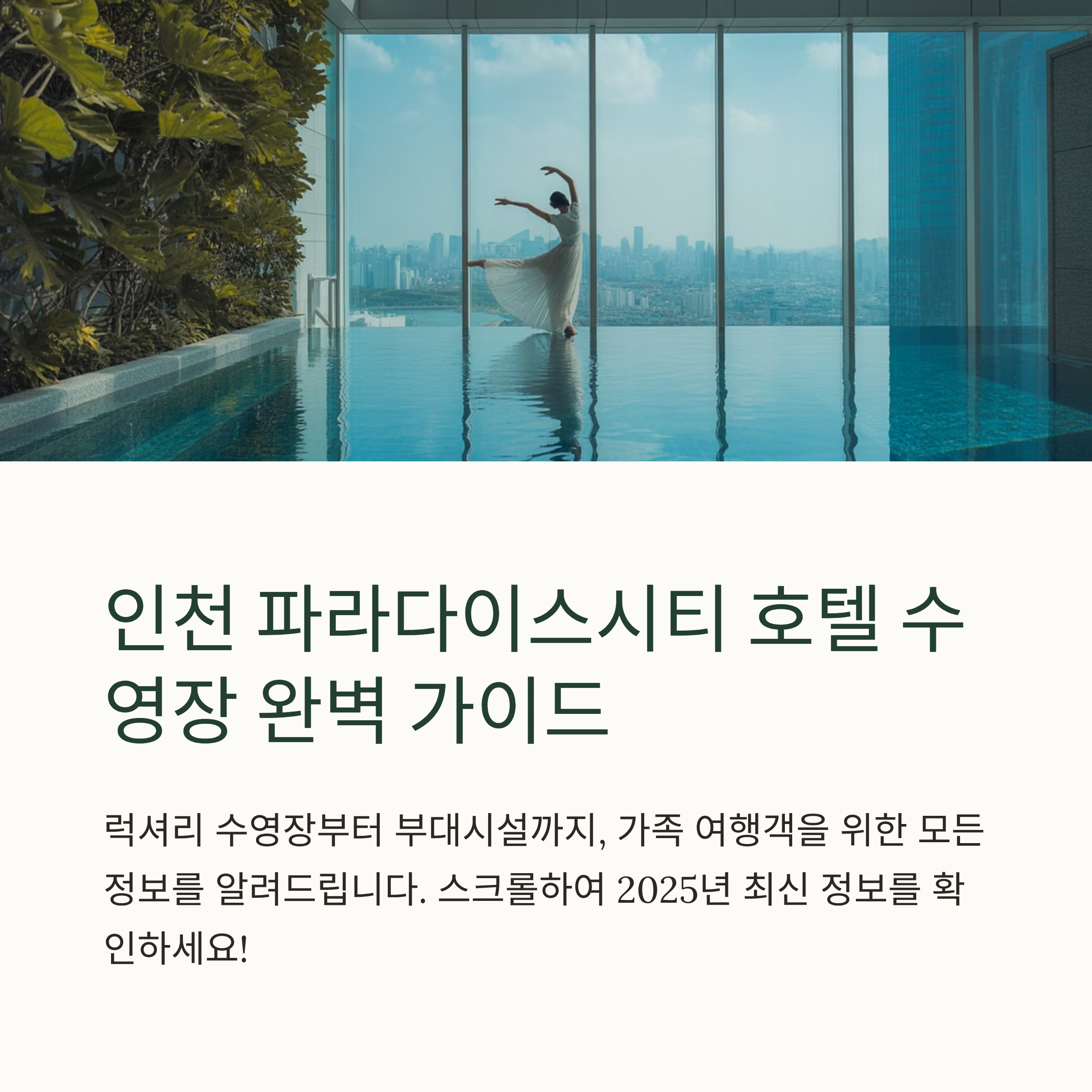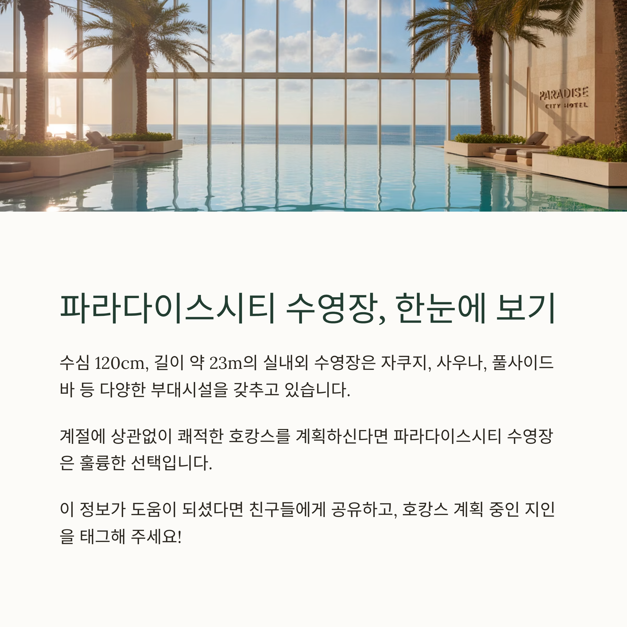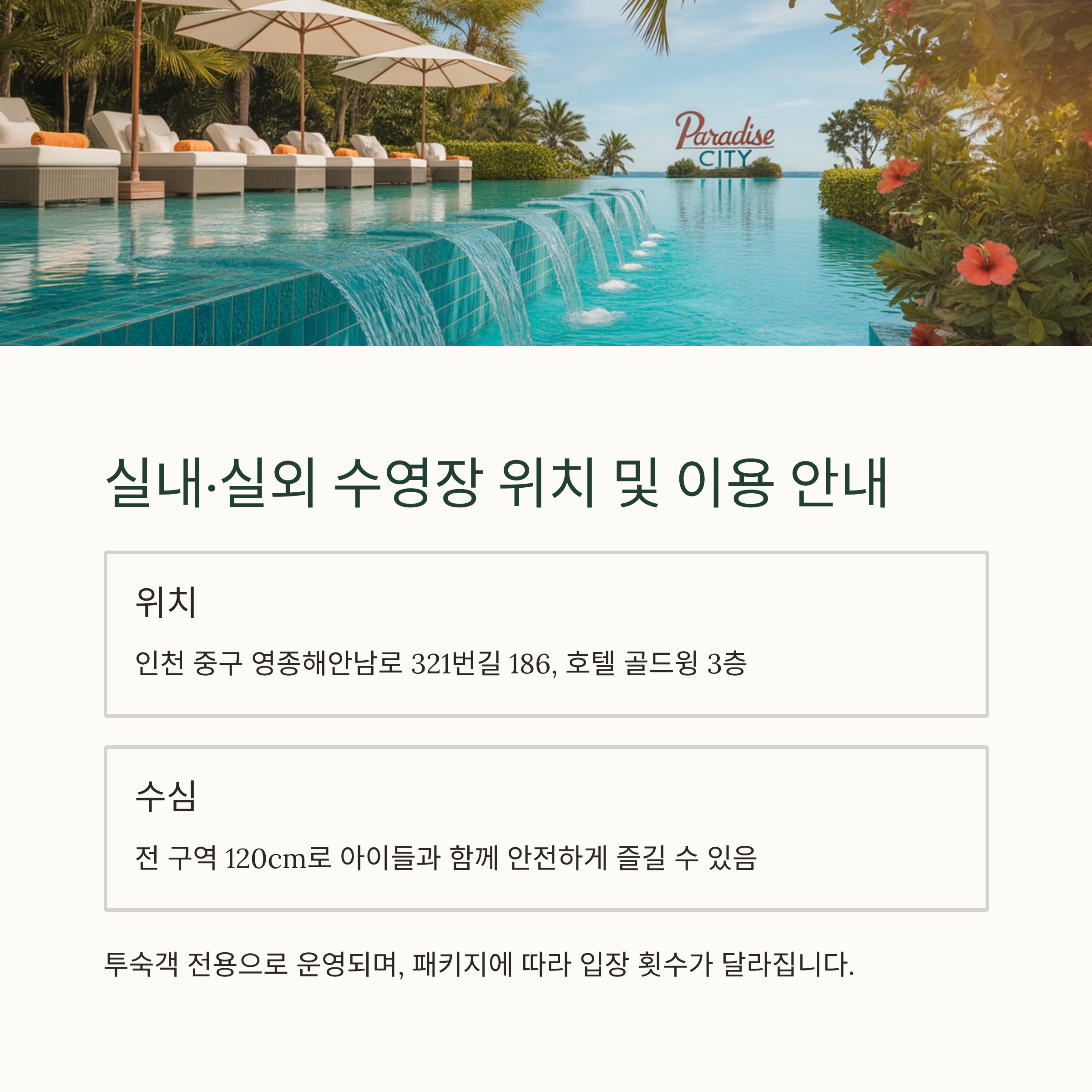 인천 파라다이스시티 호텔의 수영장은 고급스러운 분위기와 실내외 수영장 구성, 다양한 부대시설이 결합된 서울 근교 최고의 호캉스 장소로 꼽힙니다. 본 포스팅에서는 위치, 운영시간, 요금, 준비물, 부대서비스부터 시즌별 꿀팁까지 전부 정리해드리겠습니다. 가족 단위 여행객, 연인, 휴식을 원하는 1인 고객 모두에게 만족스러운 정보를 제공해 드립니다.