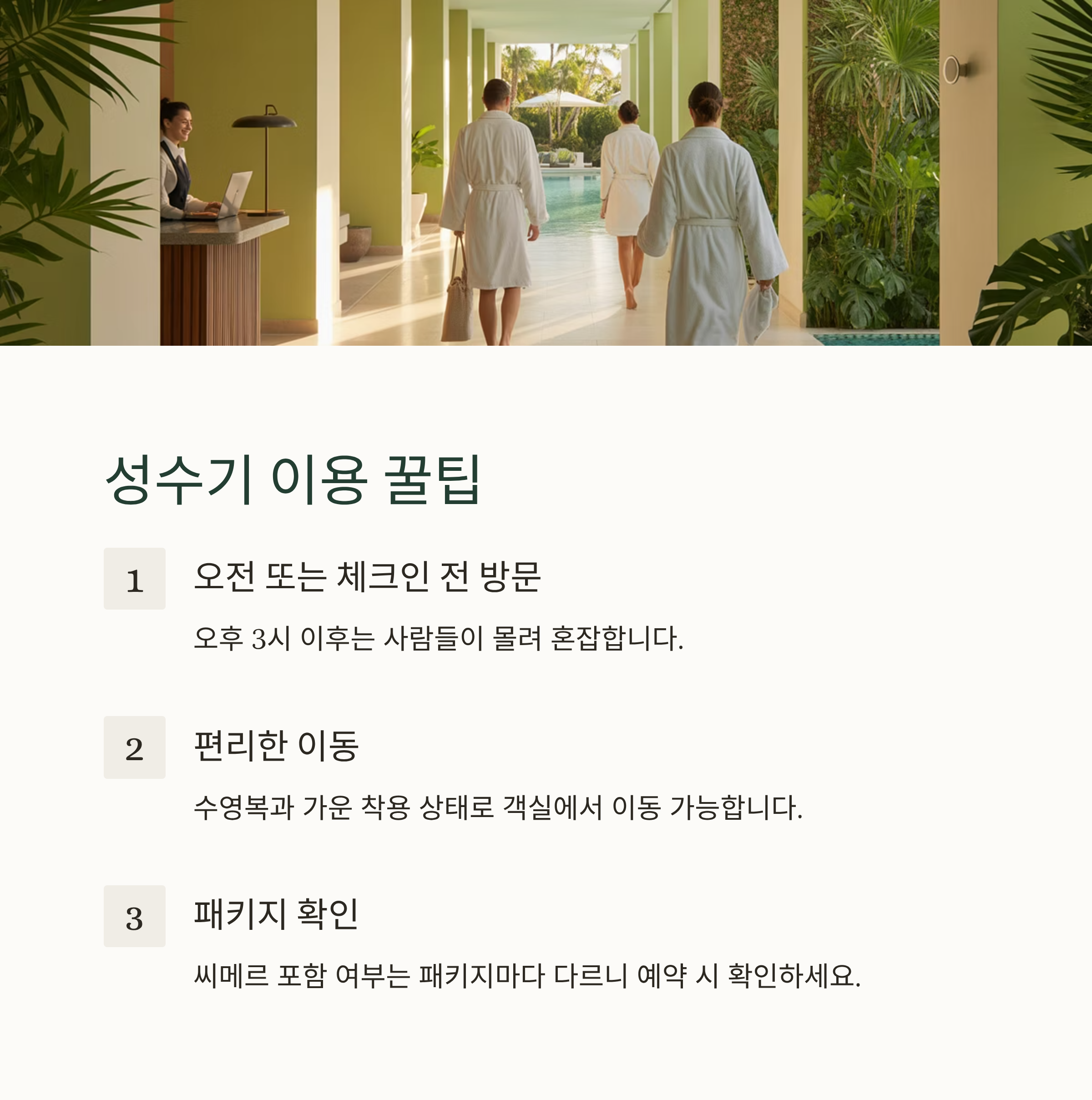 | 이동 동선 | 객실 → 수영장: 수영복+가운 착용 가능 |