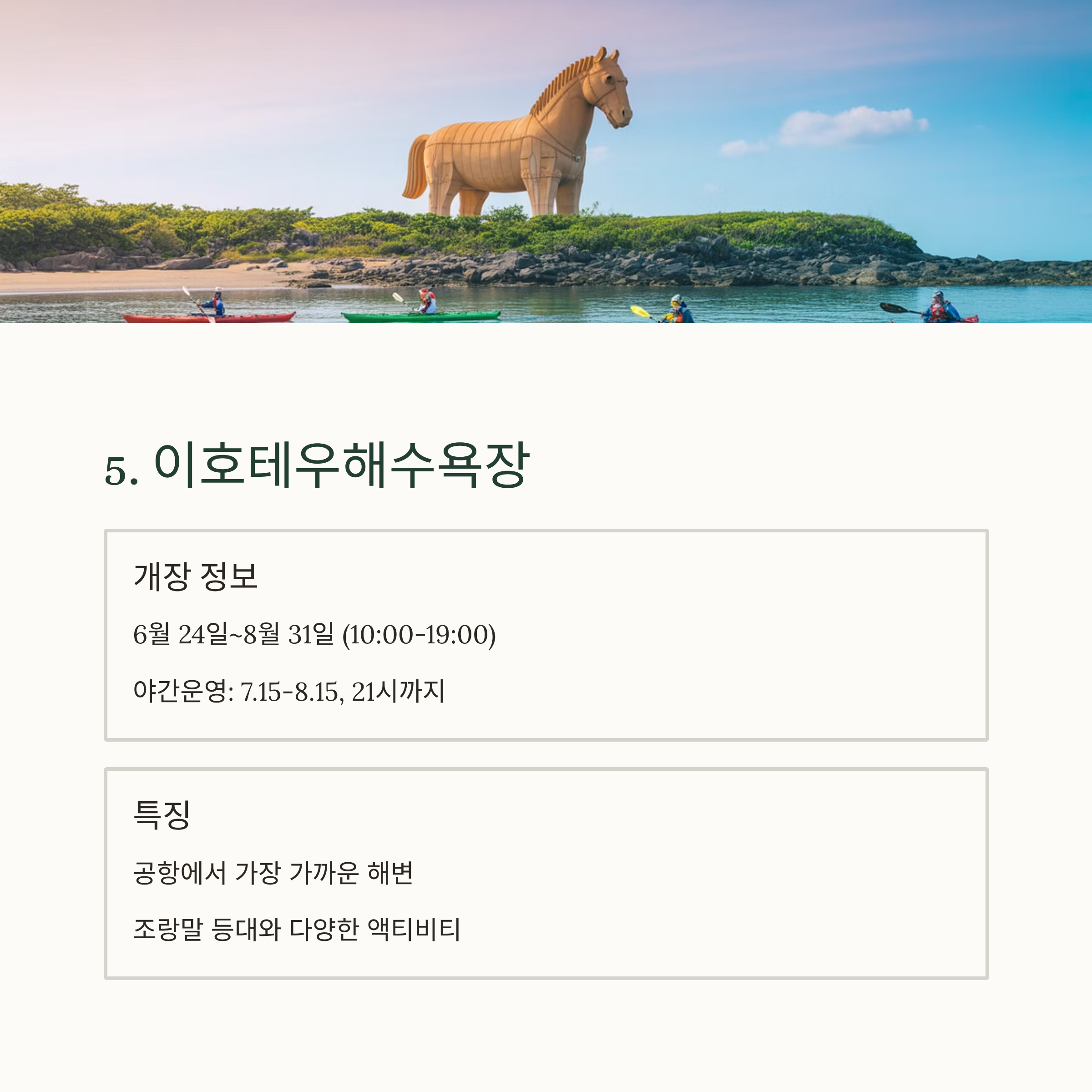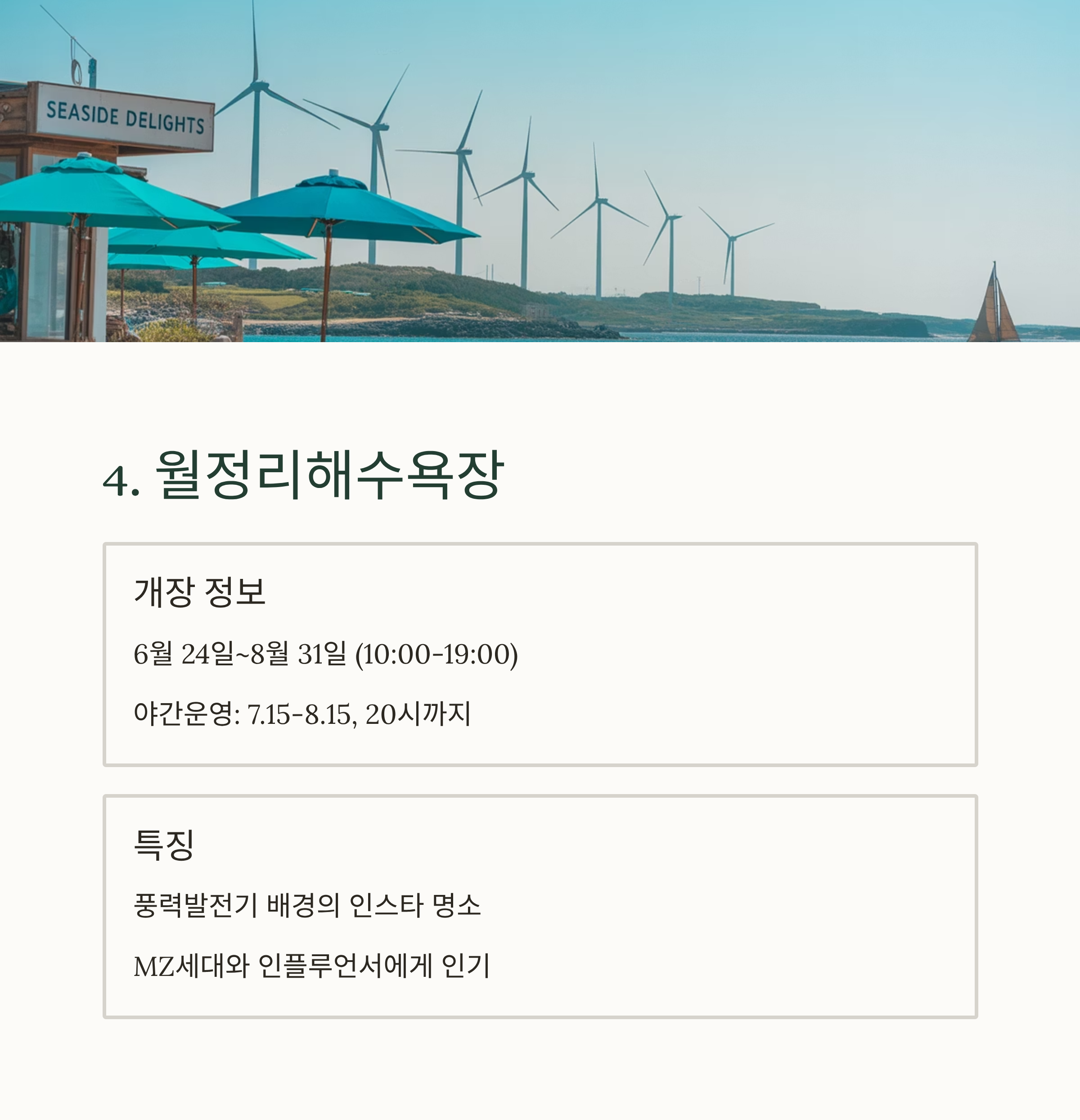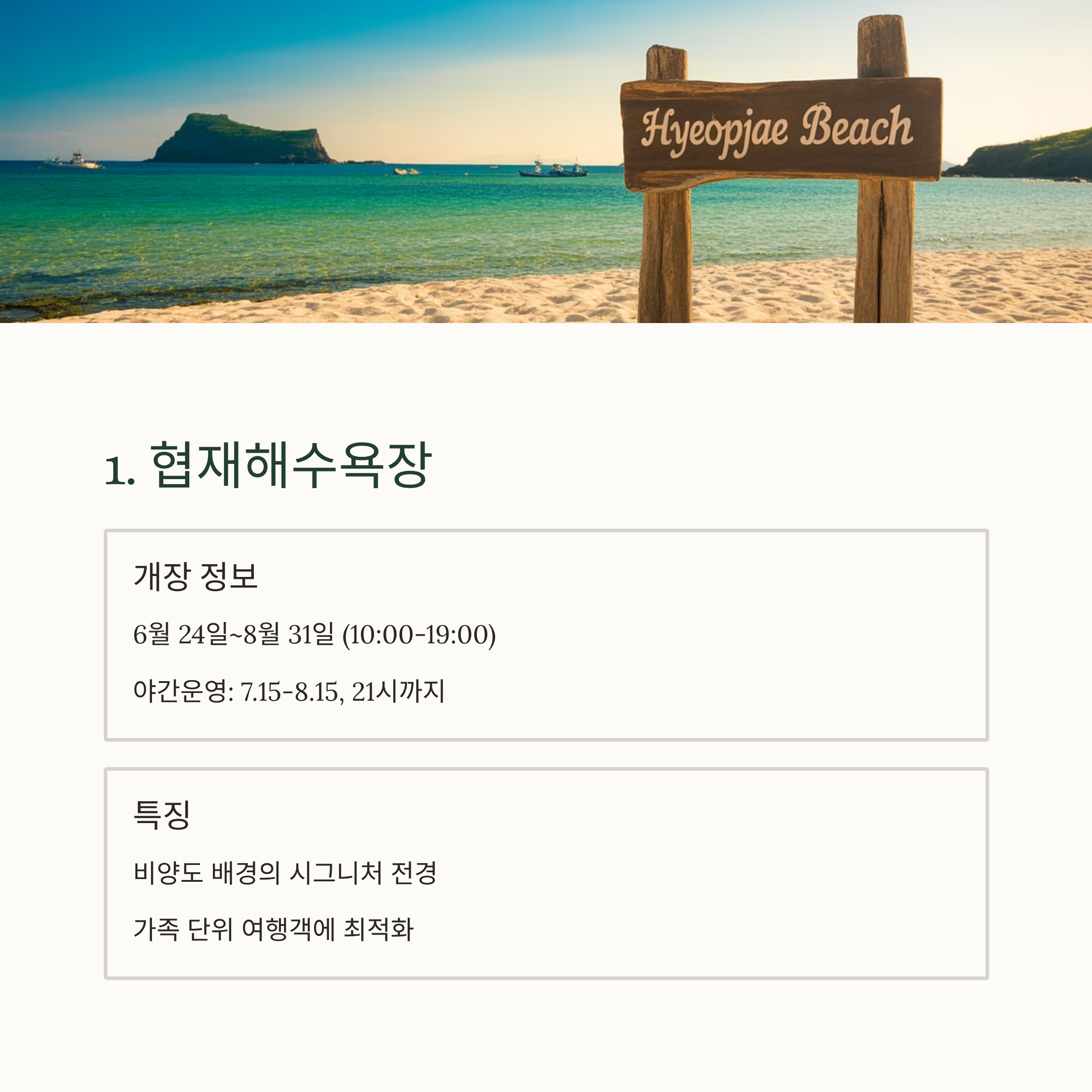 - 특이점: 풍경 + 편의성 + 인기 + 가족친화성 모두 갖춘 완성형 해변