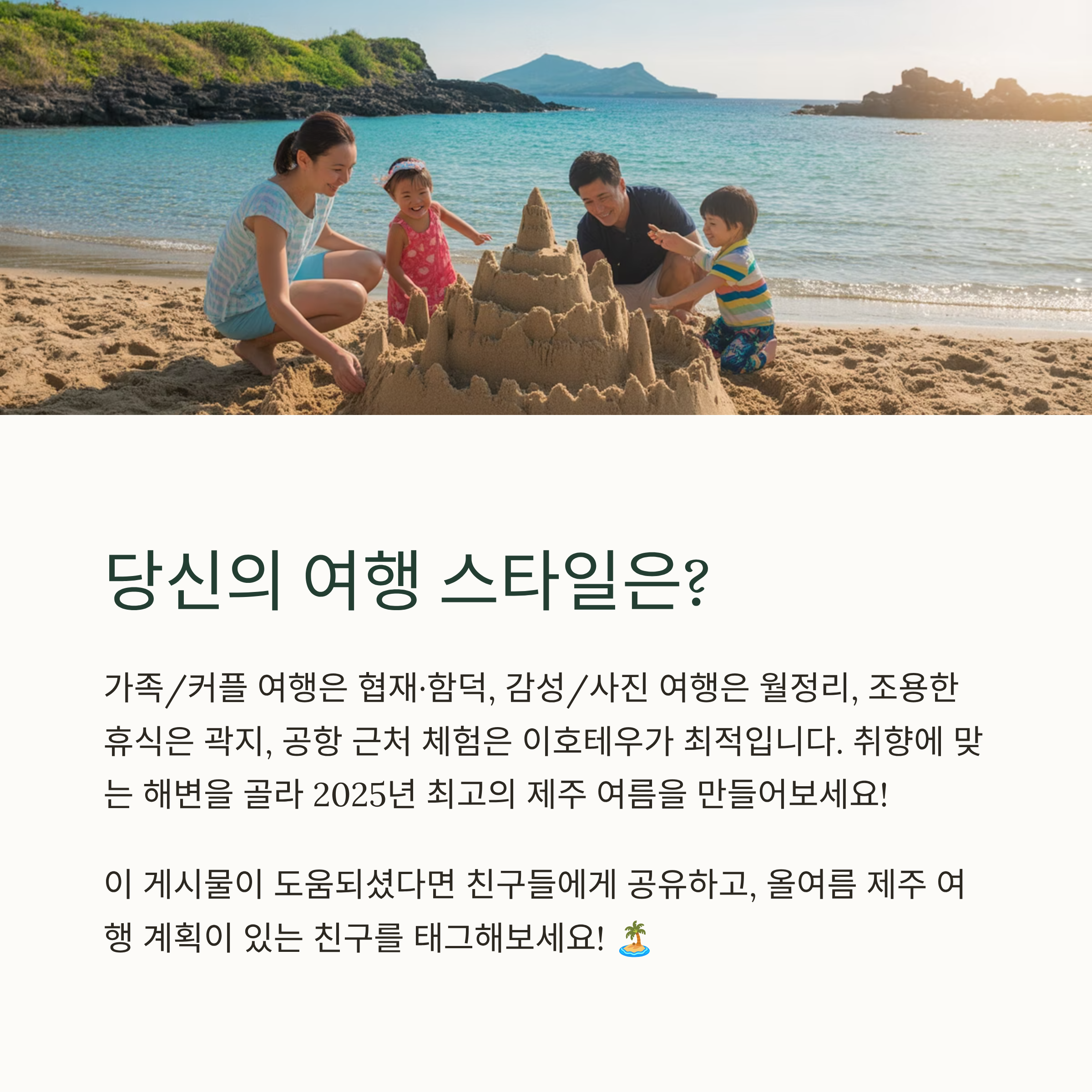 2025년 제주 해수욕장은 단순한 피서지를 넘어서, 취향 따라 골라가는 여행지로 발전했습니다. 해수욕장마다 각기 다른 매력을 가지고 있으니, 여행 스타일에 맞춰 선택해보세요. 물놀이만큼 중요한 건 ‘어디서’ 하느냐입니다. 당신만의 최고의 여름 바다를 제주에서 찾길 바랍니다.