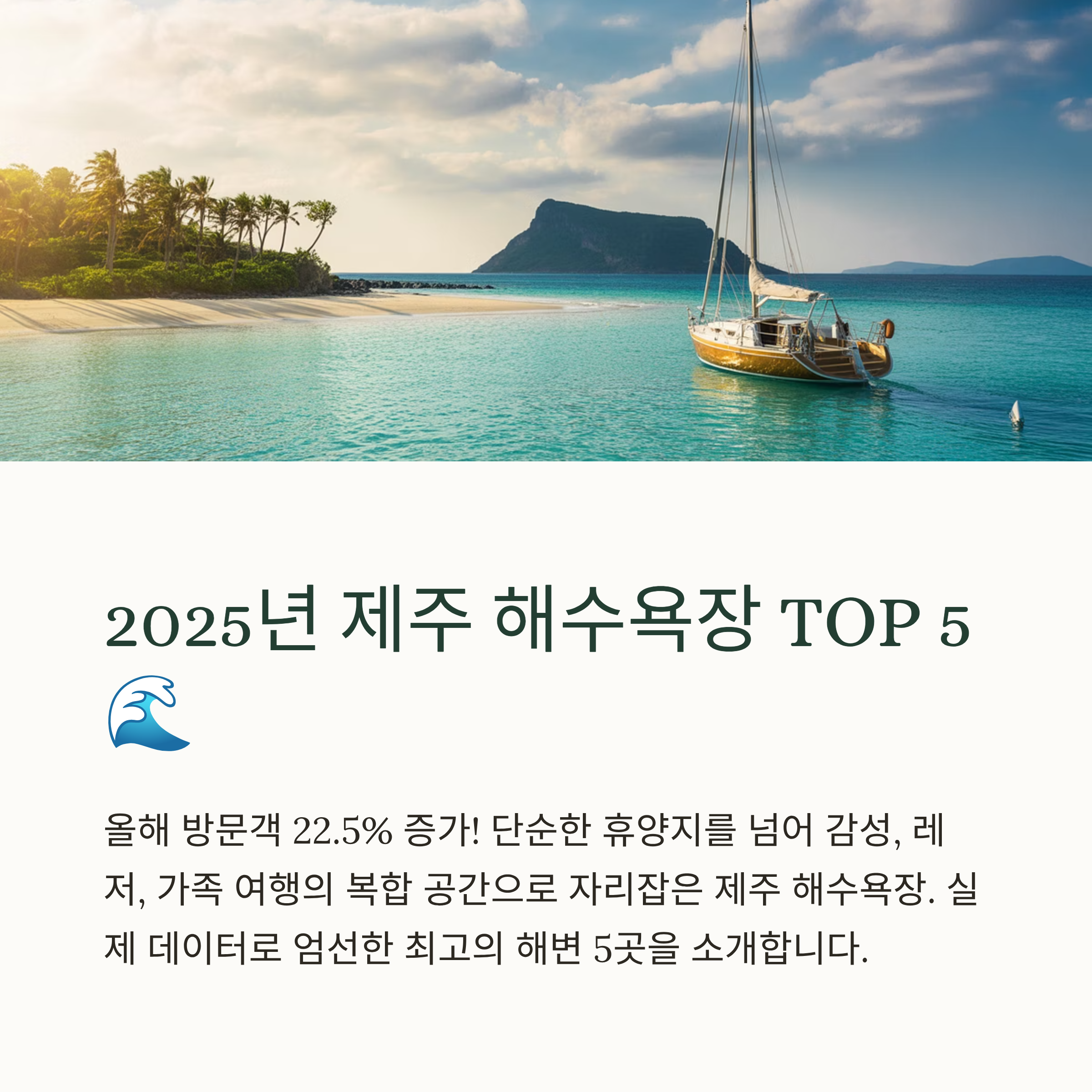 2025년 여름, 제주 해수욕장은 그 어느 때보다 많은 이들의 발걸음을 모으고 있습니다. 단순히 무더위를 피하는 휴식처가 아니라, 감성 여행과 레저, 사진 명소, 가족 여행 등 다양한 테마가 공존하는 복합적 공간으로 자리 잡았기 때문입니다. 특히 올해는 전년 대비 방문객이 22.5% 증가하며, 그 관심과 인기를 숫자로 증명했습니다. 해수욕장마다 특색 있는 풍경과 시설, 운영 방식이 다르기 때문에 제대로 알고 방문해야 더 풍성한 경험을 할 수 있습니다. 지금부터 2025년 제주에서 꼭 가봐야 할 해수욕장 5곳을 소개합니다. 이 리스트는 단순 인기 순위를 넘어 방문객 데이터, 운영 정보, 실사용자 경험을 종합해 엄선한 결과입니다.