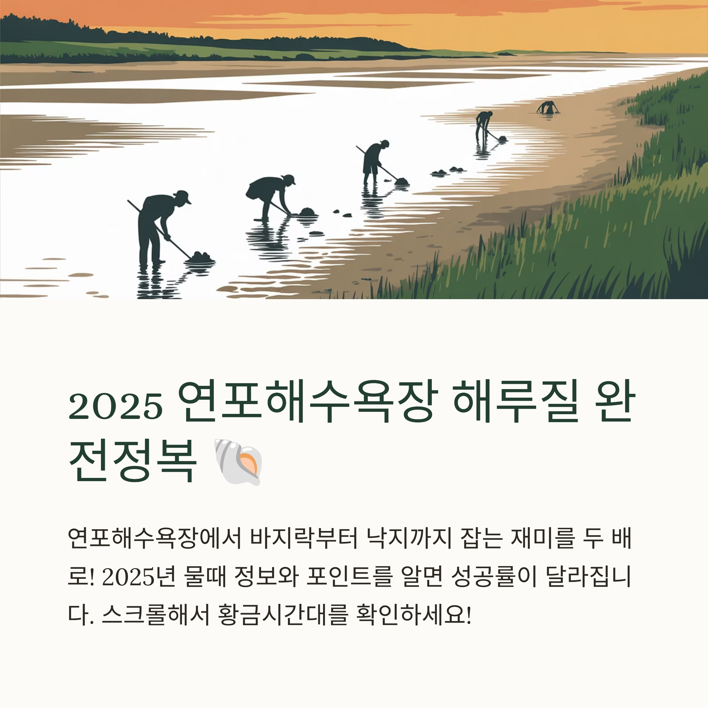연포해수욕장은 얕은 수심과 드넓은 갯벌 덕분에 해루질과 갯벌체험 명소로 사랑받는 곳입니다. 2025년 개장 일정과 물때 정보, 주요 포인트까지 모두 확인하면 바지락부터 낙지까지 잡는 재미가 두 배가 됩니다. 가족 단위 방문객도 안전하게 즐길 수 있도록 물때·장비·안전수칙까지 정리했습니다.