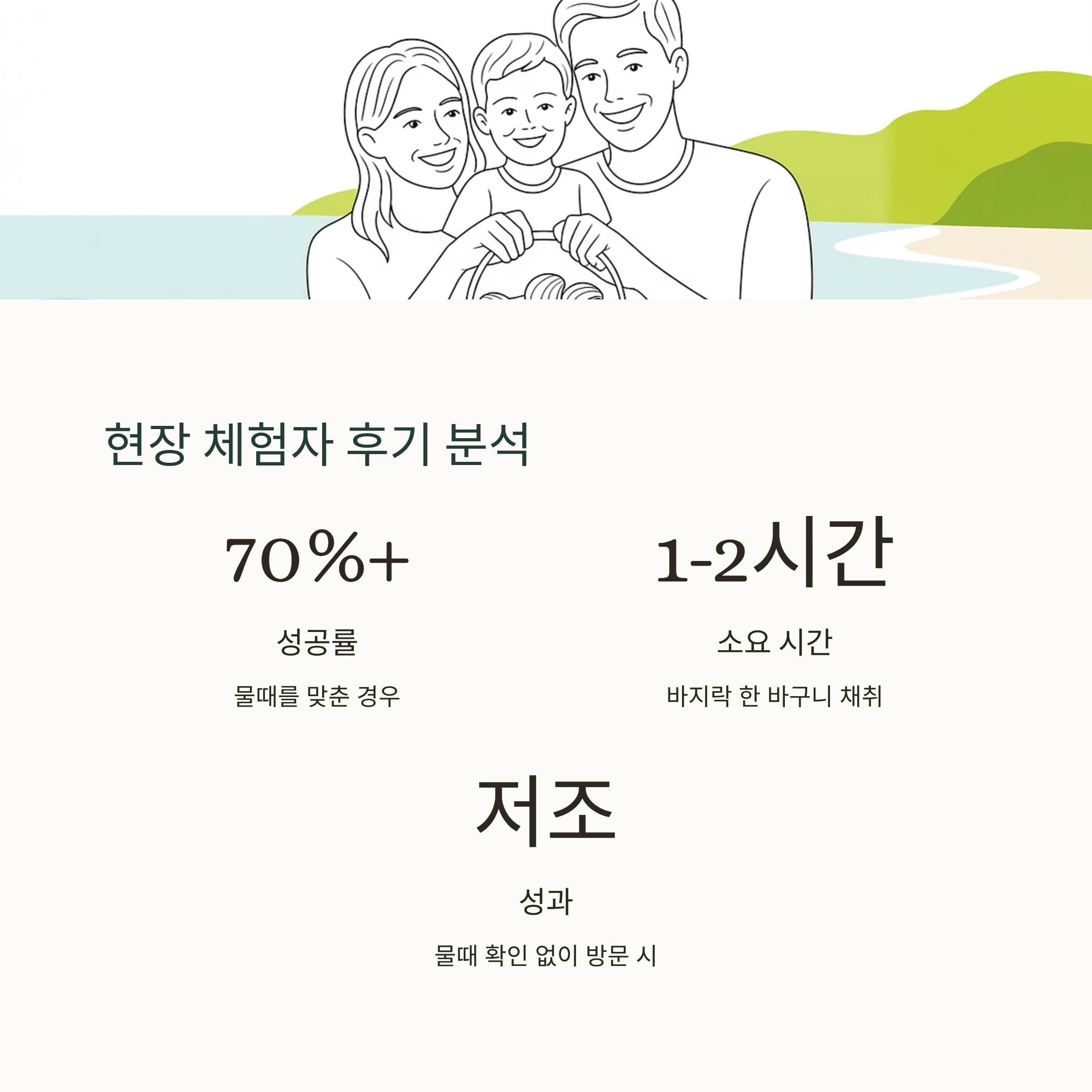 물때를 맞춘 경우 성공률은 70% 이상입니다. 1~2시간 내 바지락 한 바구니를 채취하는 경우도 흔하며, 일몰과 함께 체험을 마무리한 후 캠핑이나 바비큐로 이어가는 방문객이 많습니다. 물때 확인 없이 늦게 들어간 경우에는 성과가 저조한 편입니다.