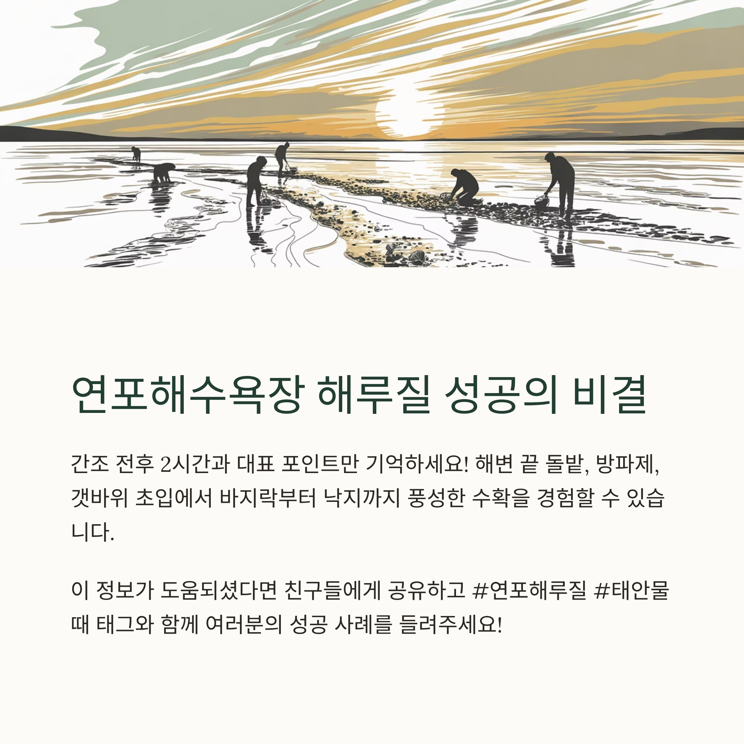 2025년 연포해수욕장에서 해루질을 즐기려면 간조 전후 2시간과 대표 포인트만 기억하면 됩니다. 해변 끝 돌밭, 방파제, 갯바위 초입은 조개부터 낙지까지 풍성한 조과를 안겨주는 명소입니다. 준비물과 안전수칙을 지키면 실패 없는 바다 체험이 가능합니다.