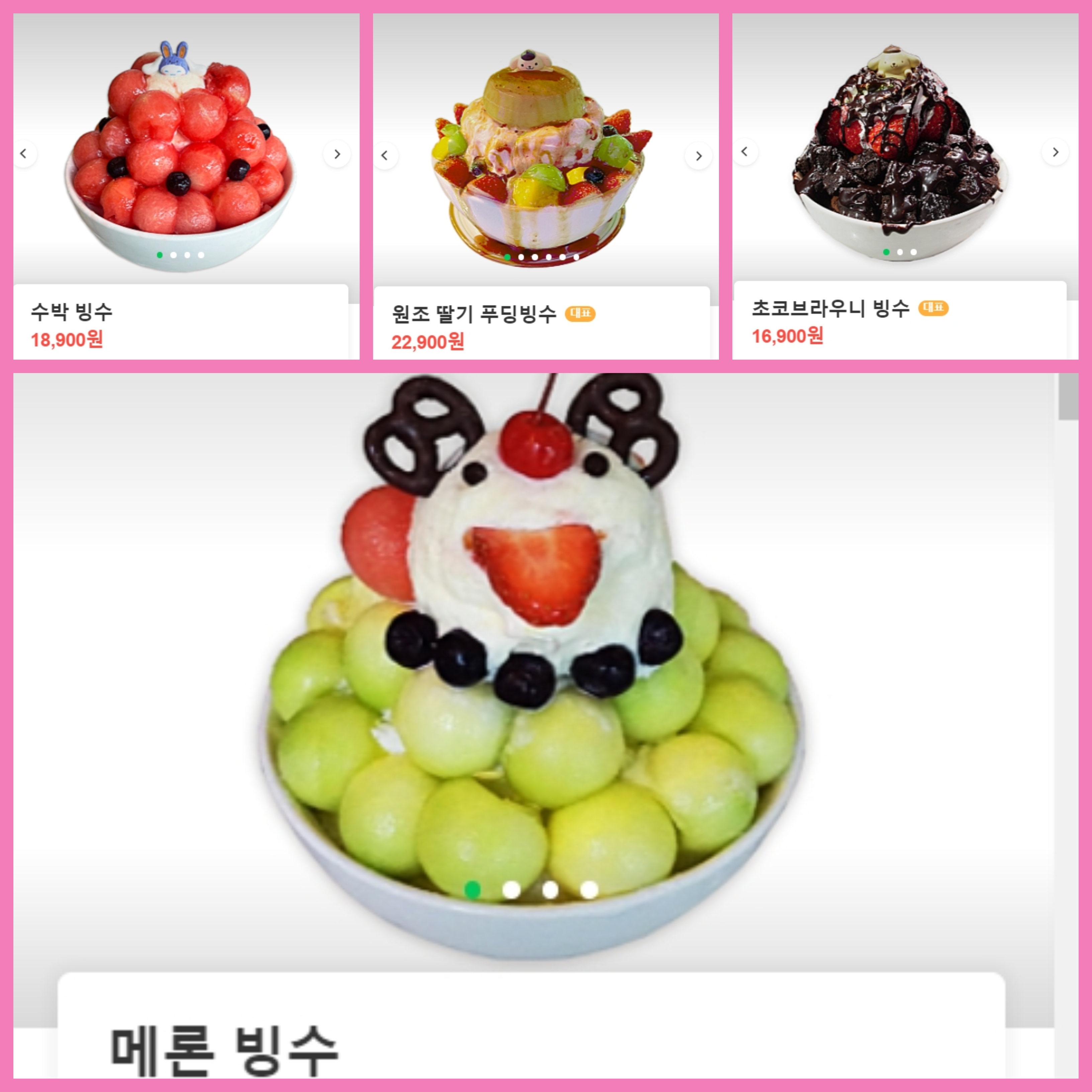 메론빙수 21,900원 수방빙수 18,900원 샤인머스캣빙수 18,900원