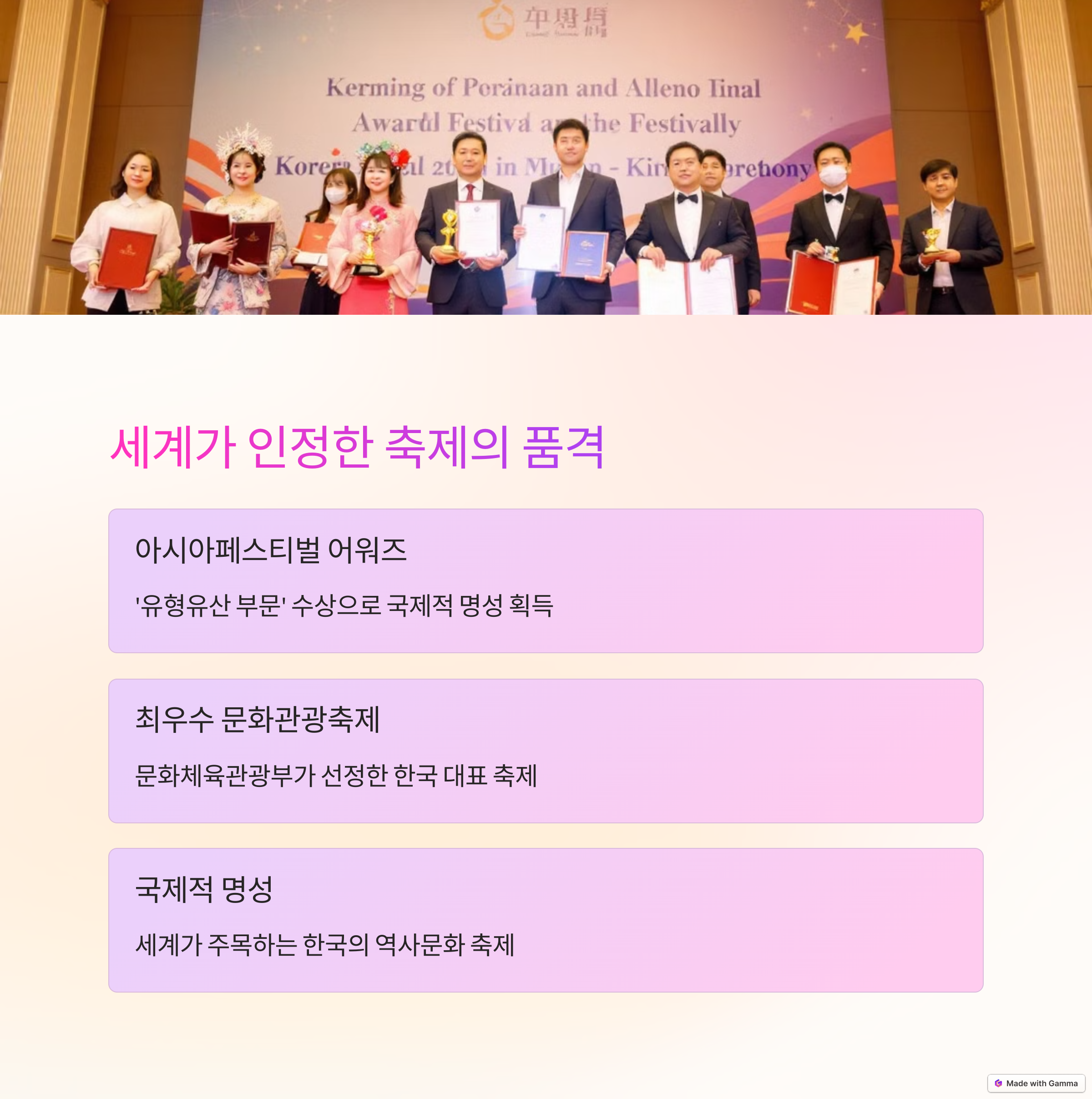 고령 대가야축제는 단순한 지역 축제가 아닌, 역사와 문화가 살아 숨 쉬는 종합 문화행사로 거듭나고 있습니다. 특히 2025 아시아페스티벌 어워즈에서의 수상은 국내를 넘어 아시아 전역에 고령의 이름을 알리는 계기가 되었습니다. 이는 단순한 인정이 아닌, 고령이 오랜 시간동안 문화유산을 보존하고 이를 관광자원으로 승화시켜 온 결과이며, 대가야의 유산이 오늘날에도 여전히 생명력을 지니고 있음을 보여줍니다. 매년 그 내용과 규모를 확장하고 있는 고령 대가야축제는 해를 거듭할수록 더욱 기대되는 대한민국 대표 봄 축제입니다.