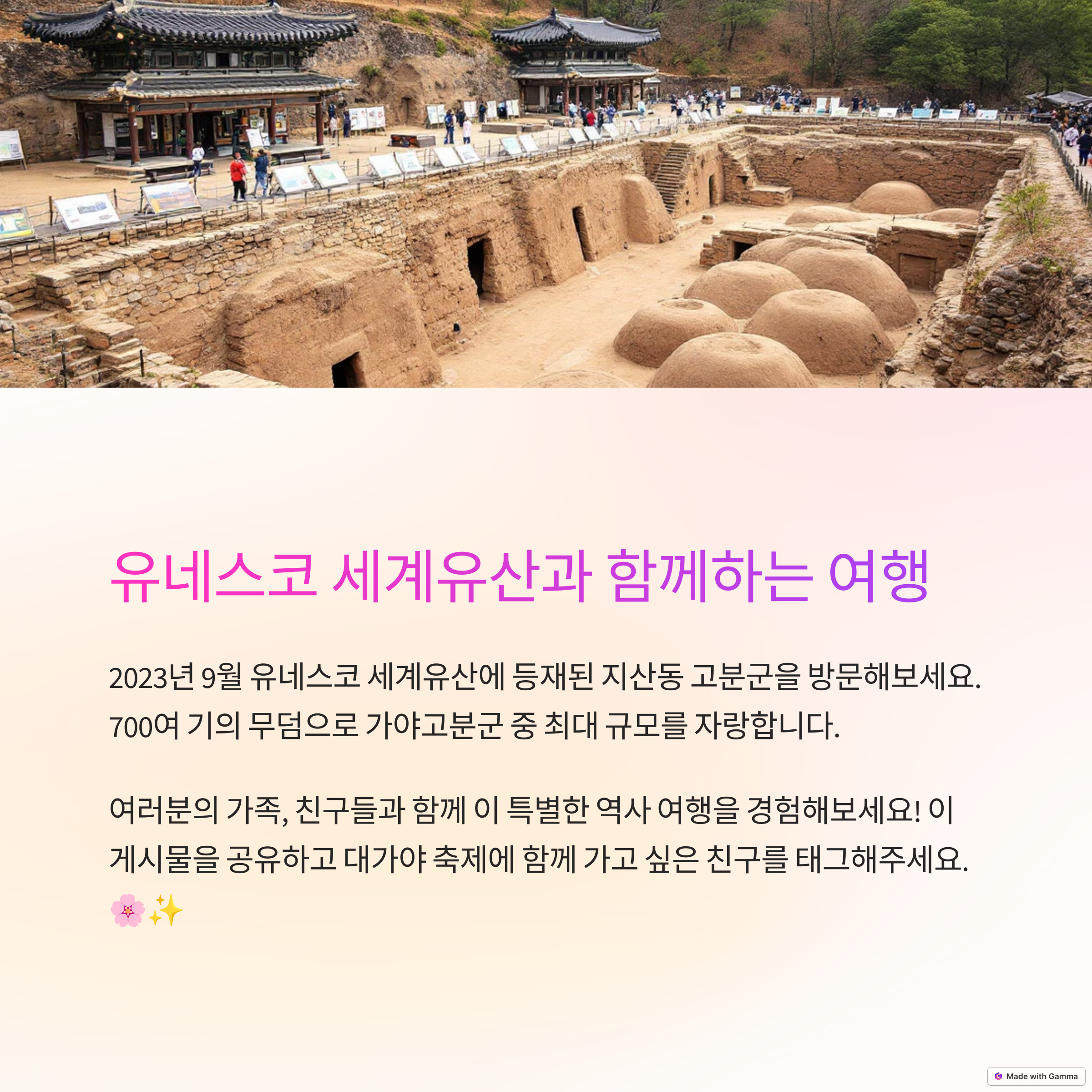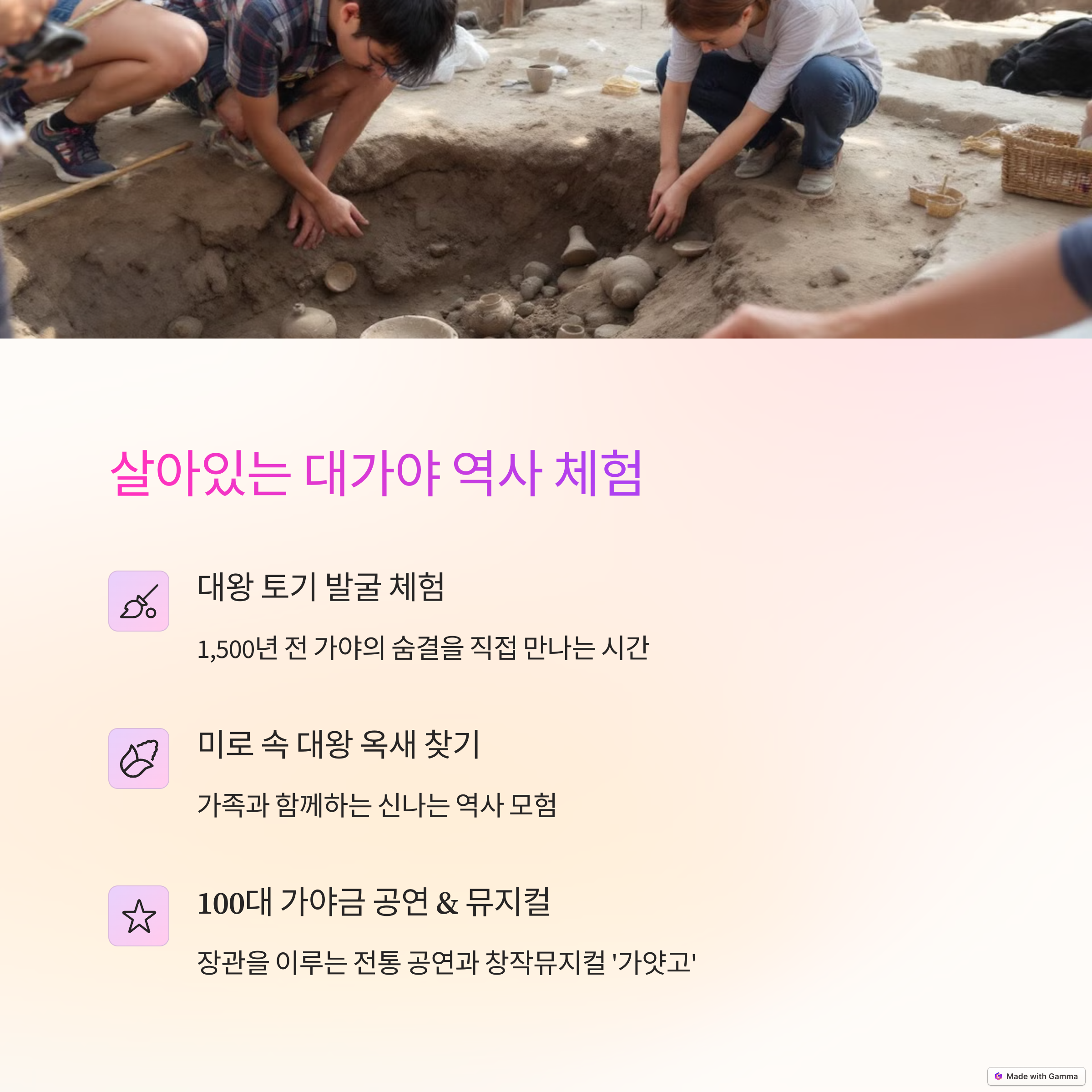 | 1500년 전 대가야 왕국의 위상을 재조명 | 지산동 고분군, 유네스코 세계유산 등재 | 아이들과 함께하는 다양한 놀이와 체험 |