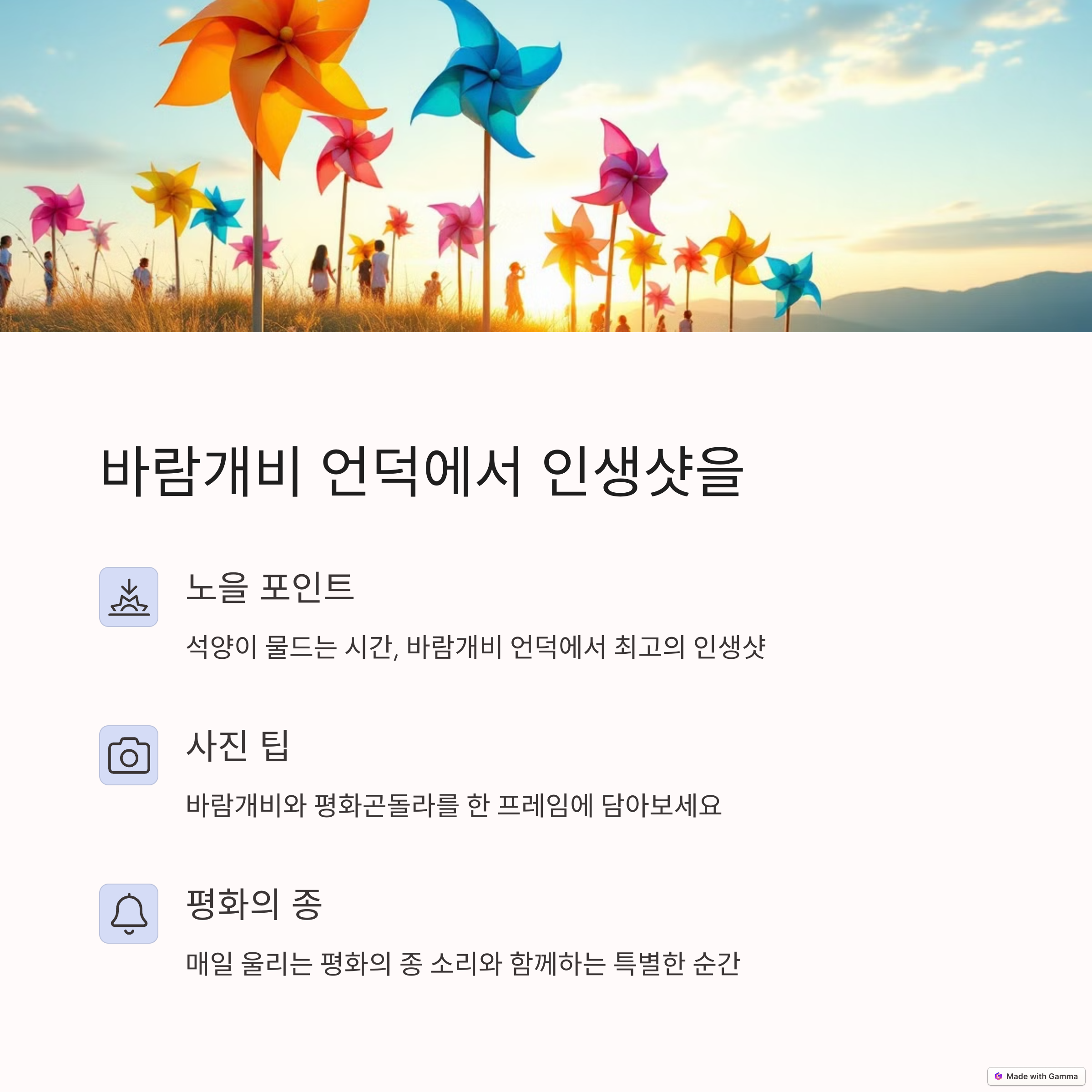 | 평화의 종과 잔디 언덕에서 인생샷 가능 | 주변 자연 경관이 뛰어나 산책 코스로 추천 | 독창적인 건축물 배경으로 감성사진 촬영 |
