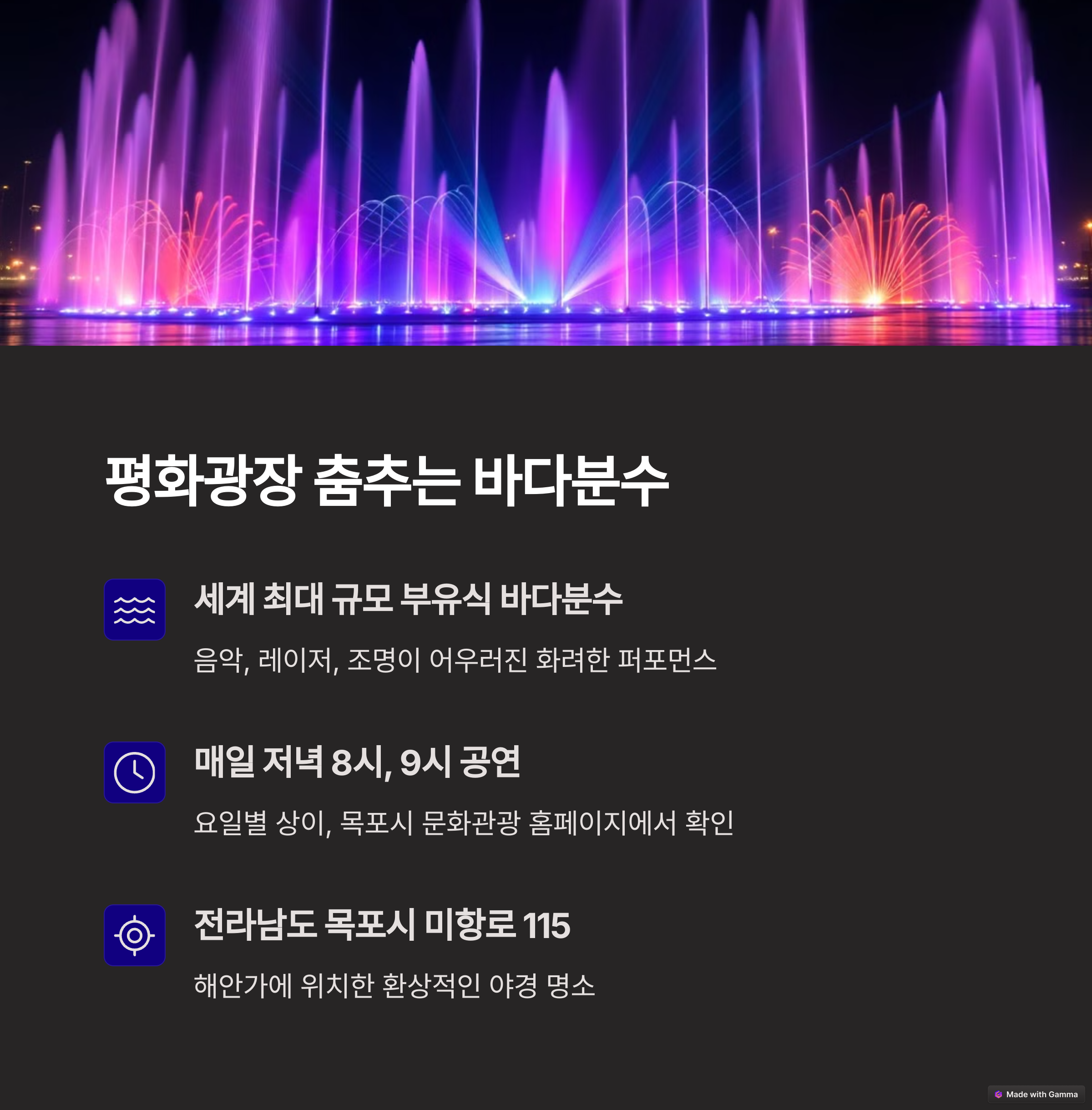 | 로맨틱한 조명과 데크가 매력적인 바위 명소 | 음악과 조명 쇼가 결합된 감성 분수 공연 | 목포 야경 전체를 감상할 수 있는 전망 포인트 |