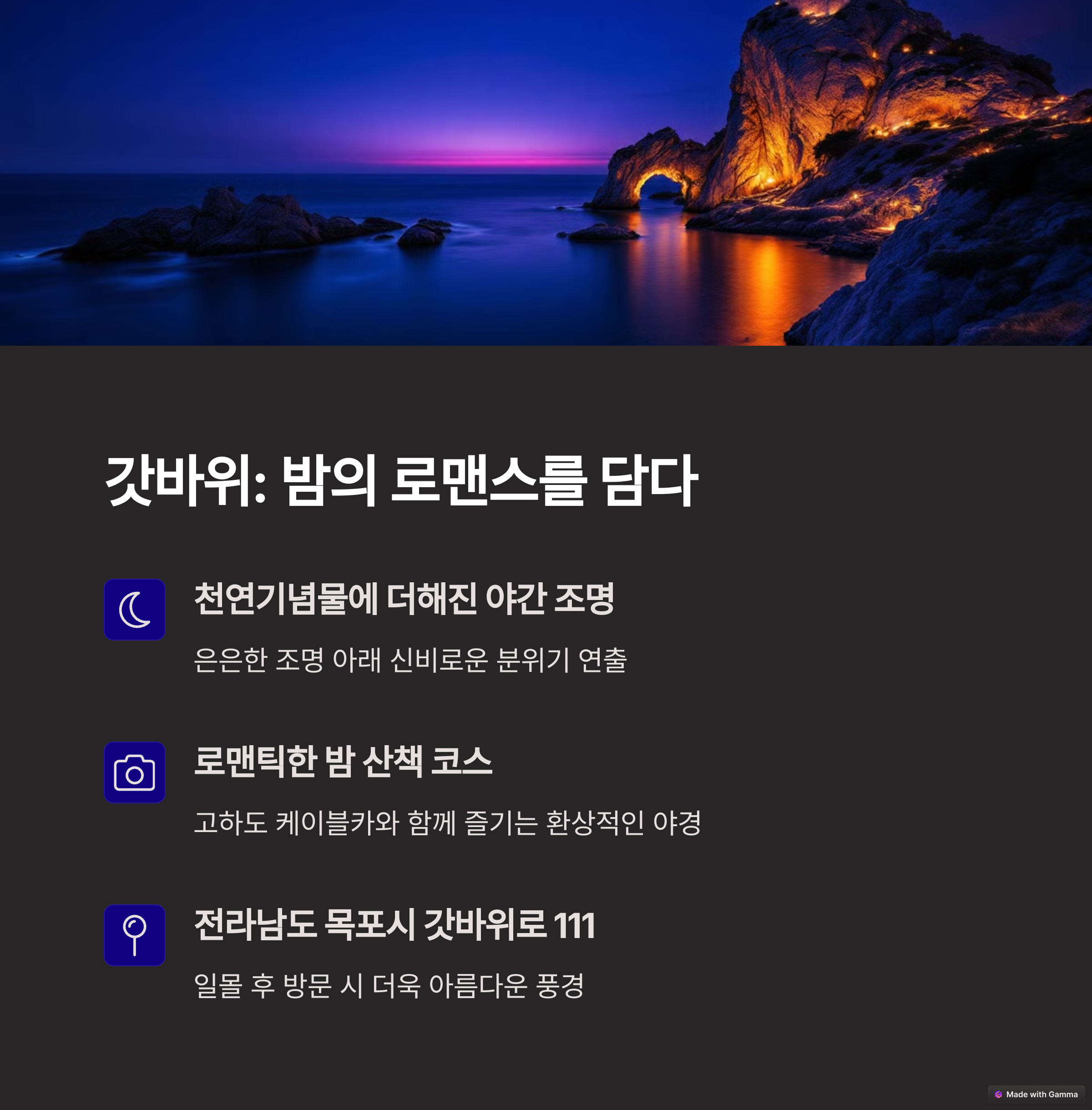 | 목포 갓바위 | 밤 조명과 함께 로맨틱한 분위기를 자아내는 장소 |