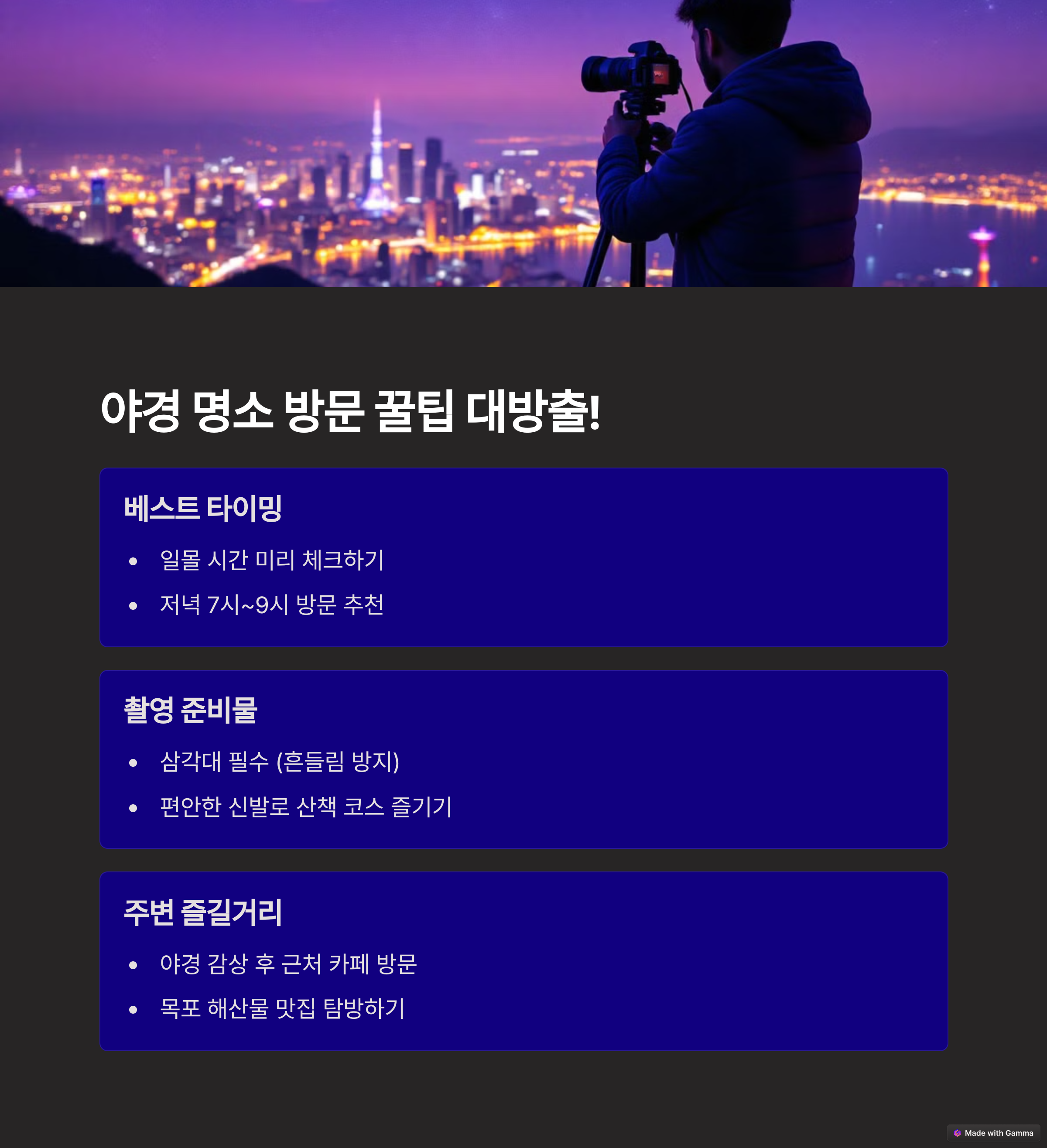 목포의 야경은 단순한 경치를 넘어서, 여행의 감동을 배가시켜 주는 특별한 경험을 선사합니다. 갓바위, 바다분수, 유달산 조각공원은 각각 다른 매력으로 여행자들의 마음을 사로잡으며, 사진 한 장에도 깊은 감성을 담을 수 있는 장소들입니다. 계절과 시간에 따라 색다른 모습을 보여주는 목포 야경을 직접 느껴보고, 감동을 기록해보세요. 오늘 밤, 그 특별한 풍경 속에서 당신만의 이야기가 시작될지도 모릅니다.