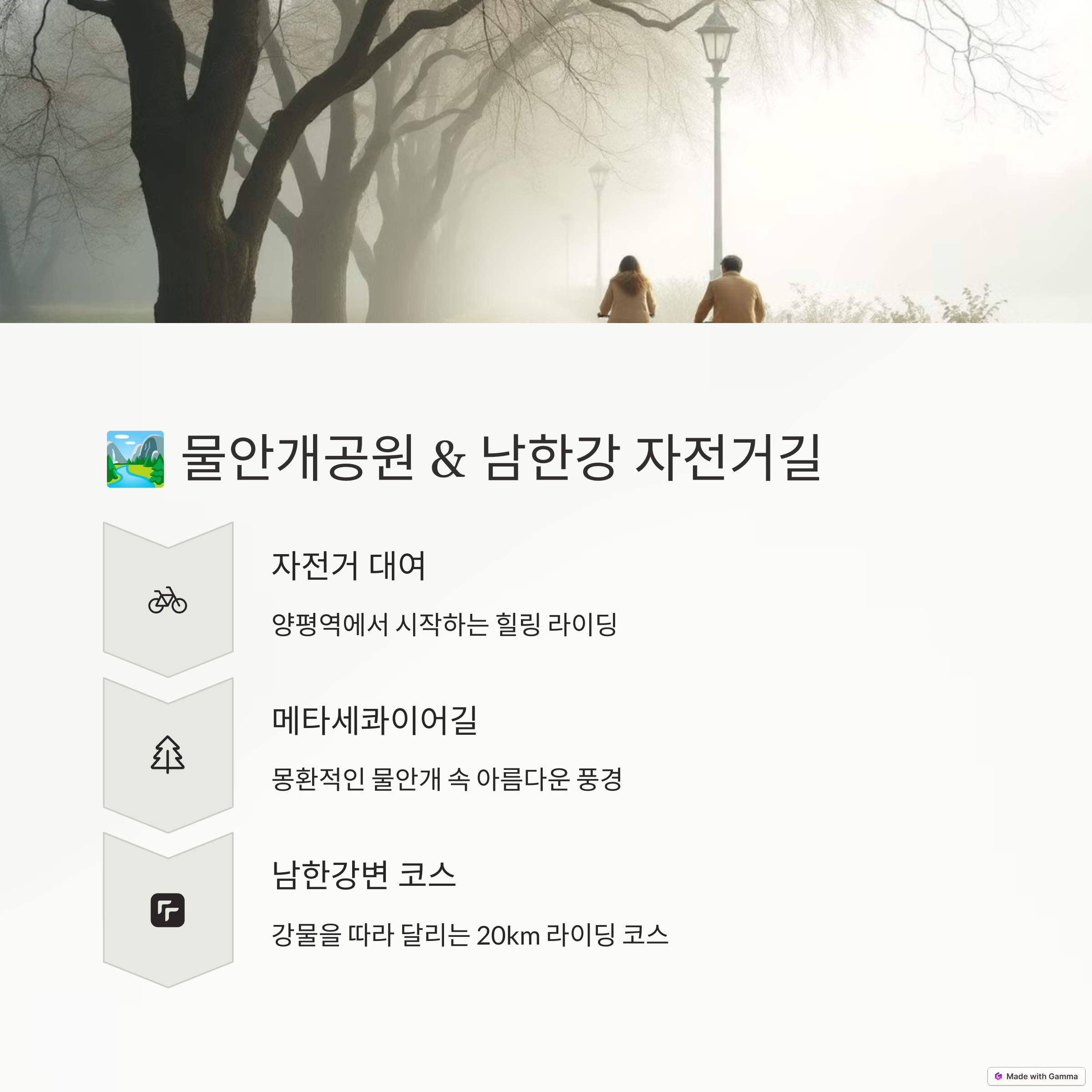 | 물안개공원, 청춘뮤지엄 | 자전거 타기, 복고 사진 촬영 | 물안개공원 → 자전거길 → 청춘뮤지엄 |