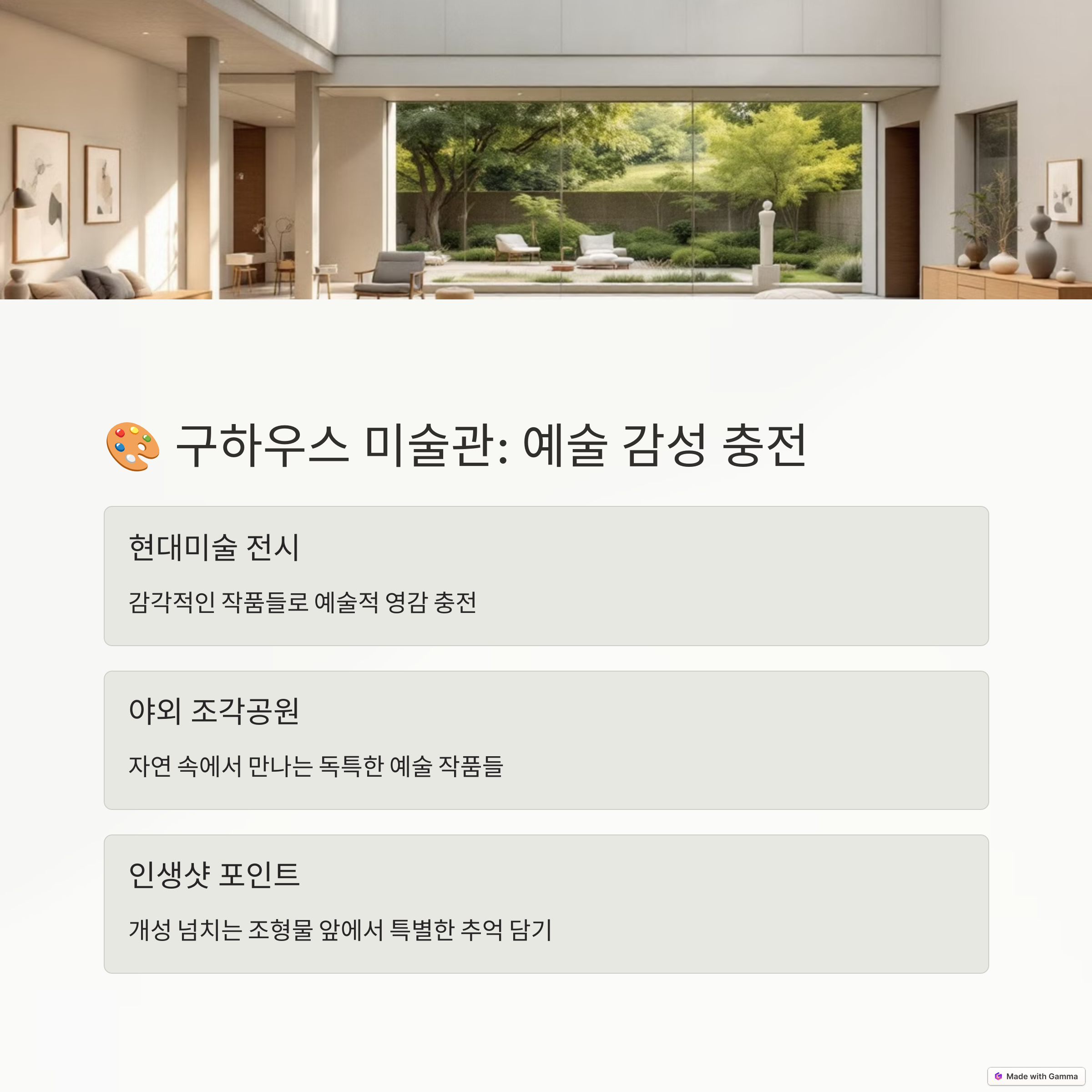 | 두물머리, 세미원, 구하우스 미술관 | 강변 산책, 예술 관람, 교복 체험 | 두물머리 → 세미원 → 더그림 → 미술관 |