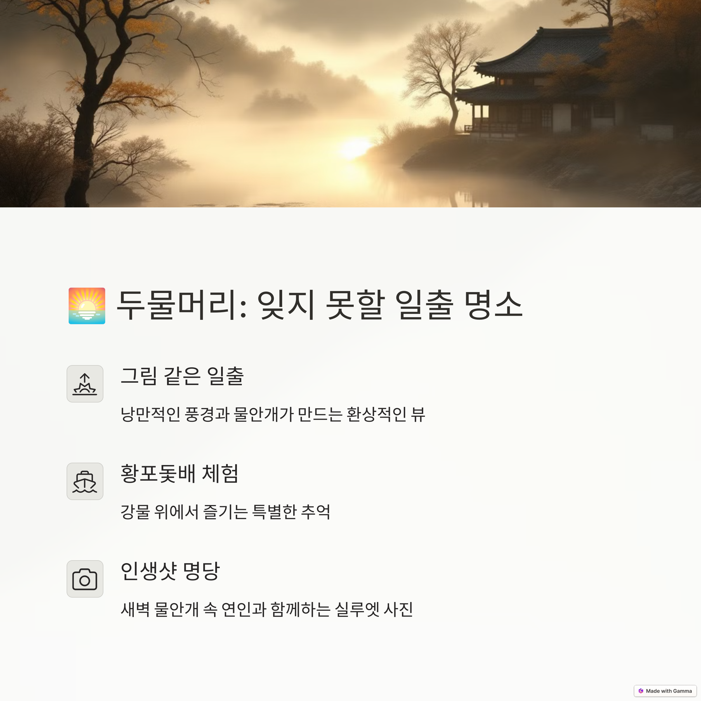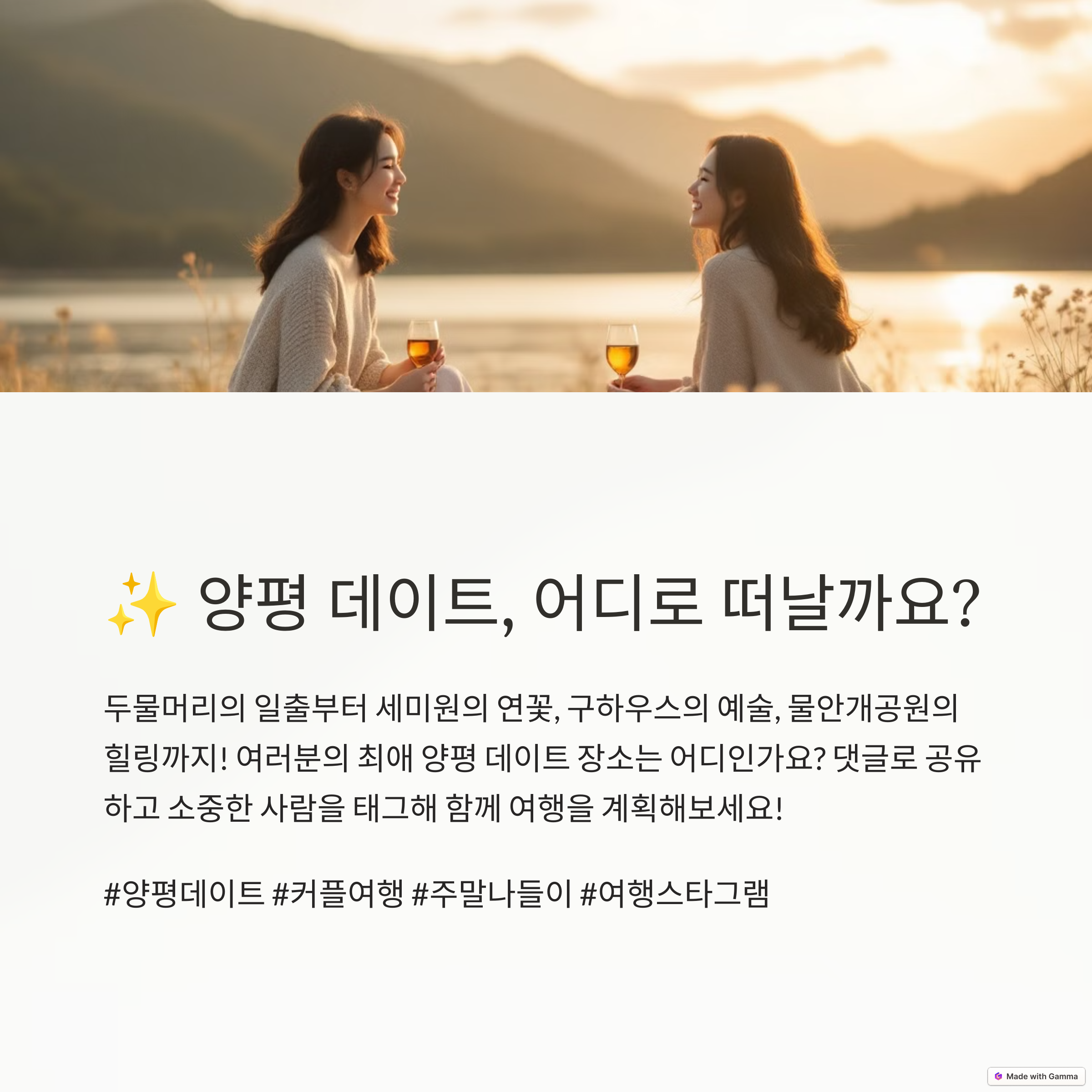 서울 근교에서 특별한 데이트를 계획하고 있다면 양평은 꼭 한 번 가봐야 할 곳입니다. 자연의 아름다움, 예술적인 감성, 힐링되는 공간들이 다양하게 존재하며, 어떤 취향의 커플이라도 만족할 만한 코스를 구성할 수 있습니다. 두물머리의 아침 산책, 세미원의 여유로움, 더그림 카페의 낭만까지 하루가 짧게 느껴질 만큼 풍성한 경험이 기다리고 있습니다. 이번 주말, 양평으로 나들이를 떠나 사랑하는 사람과 소중한 추억을 만들어보세요.