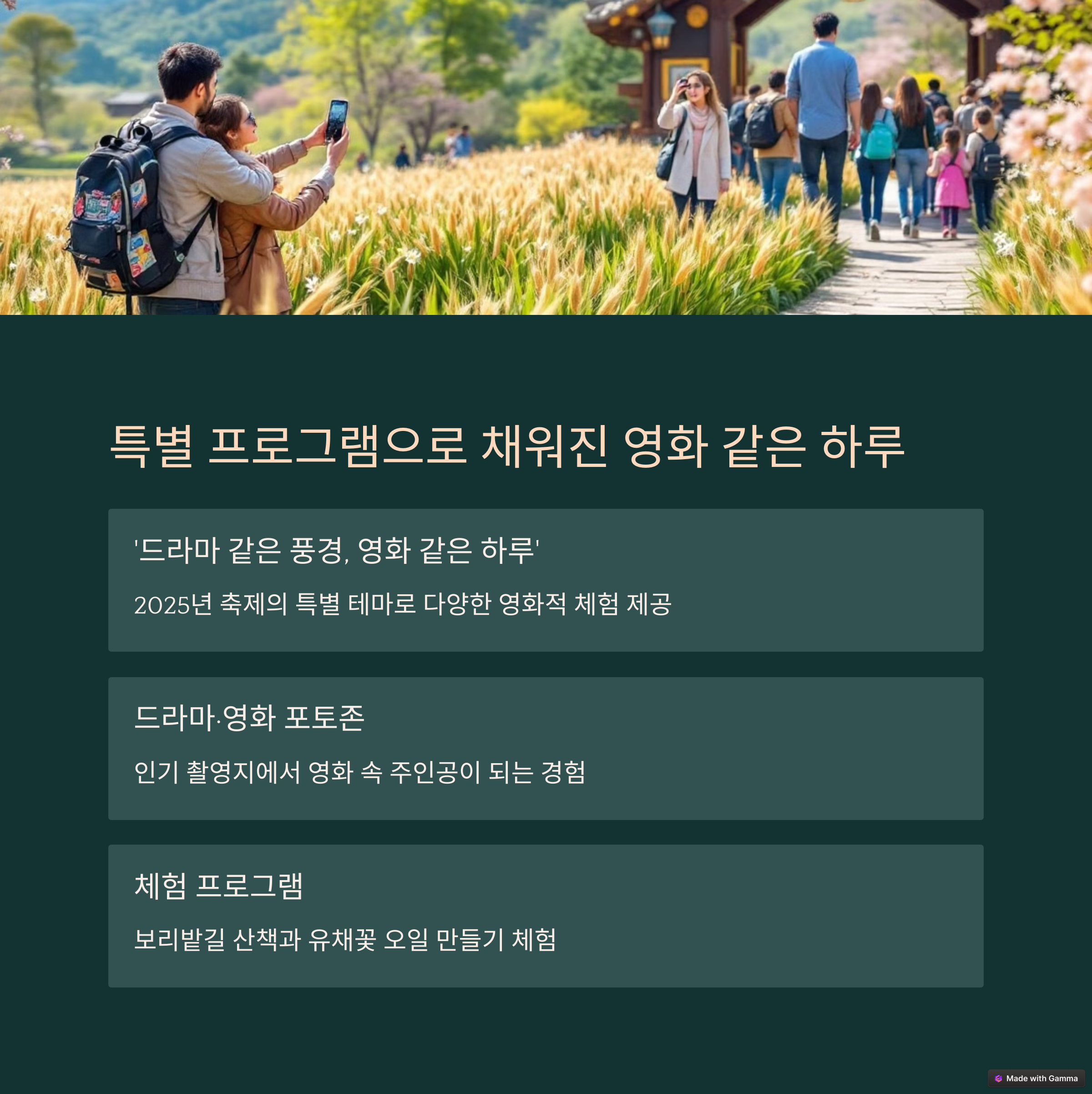 올해의 주제는 ‘드라마 같은 풍경, 영화 같은 하루’로 선정되어 영화나 드라마 속 장면을 직접 체험할 수 있는 포토존이 운영됩니다. 대표적으로 드라마 ‘쓸쓸하고 찬란하神 – 도깨비’의 배경지로도 유명한 청보리밭은 감성 가득한 인증샷을 남기기 제격입니다. 음악 공연, 보리 새싹 체험, 유채꽃 오일 만들기 등 다양한 체험 프로그램이 함께 운영되어 연인, 가족, 친구들과 특별한 시간을 보내기에 완벽한 여행지입니다.