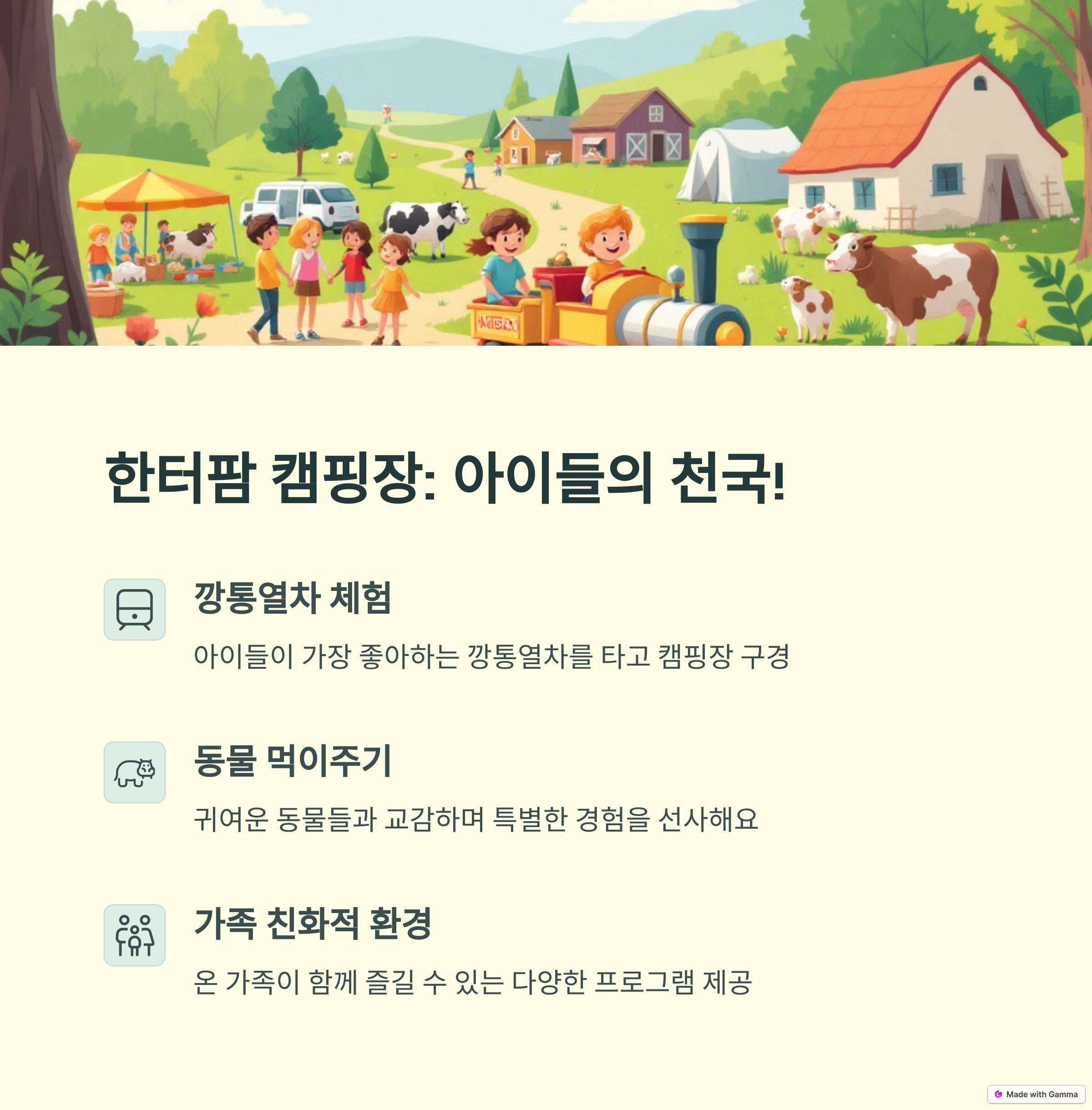 트램펄린, 수영장, 키즈카페 등 놀이시설 완비 숲속 자연 속 캠핑, 밤하늘 별 보기 가능 깡통열차, 버블폼, 모험 프로그램 운영