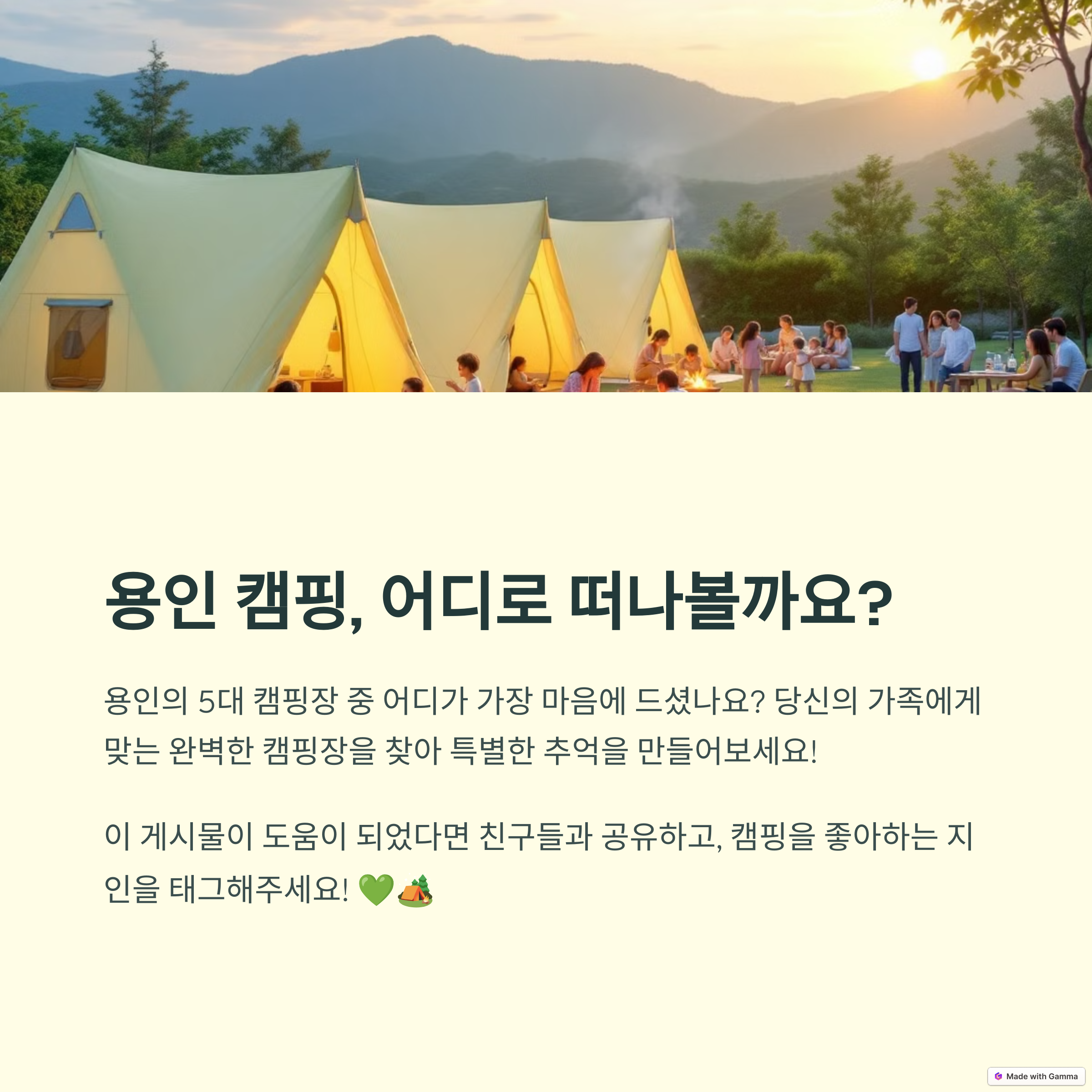 이 글에서 소개된 캠핑장 외에도 추천하고 싶은 용인의 숨은 명소가 있다면 댓글로 공유해주세요! 캠핑을 사랑하는 많은 분들에게 큰 도움이 될 수 있습니다.