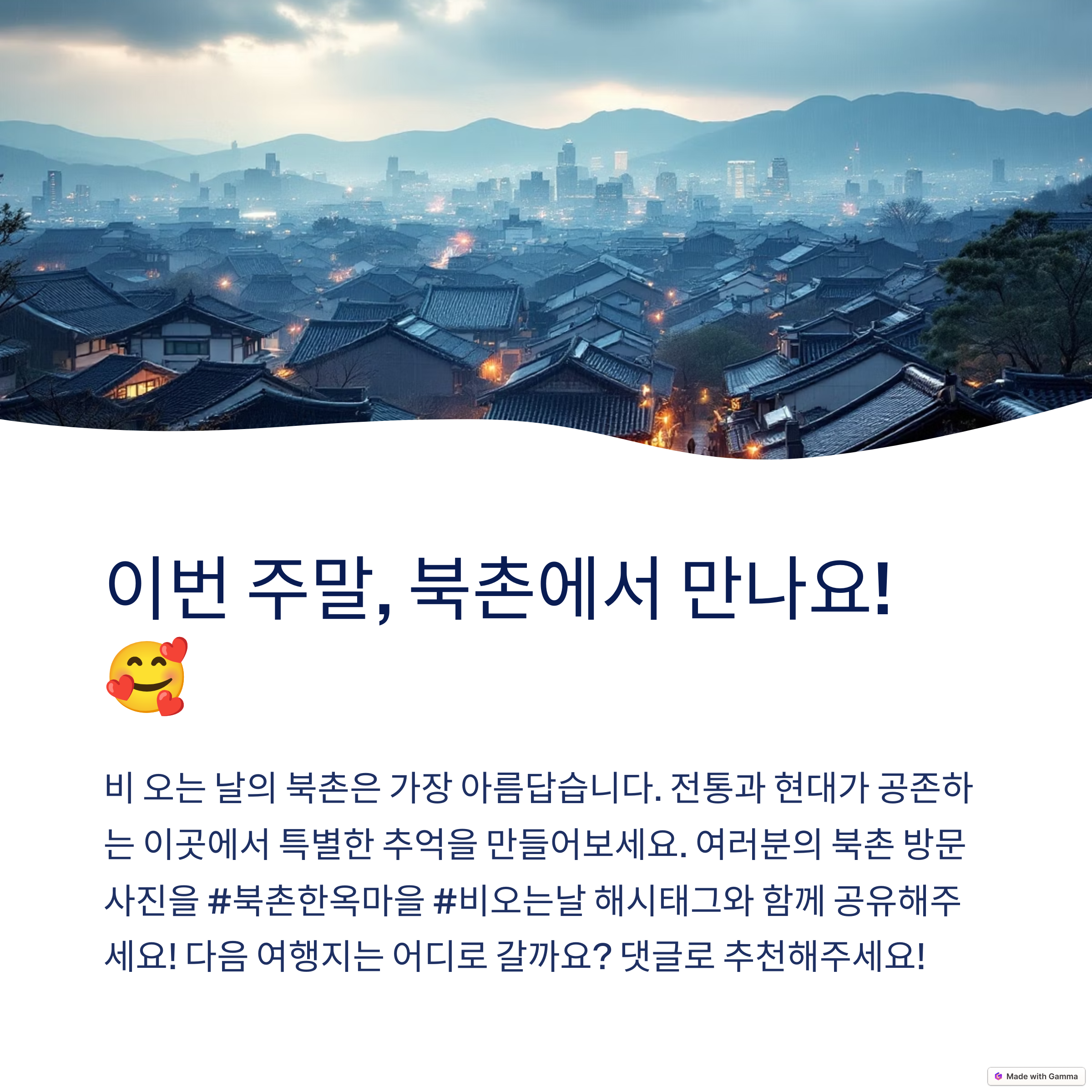 북촌 한옥마을은 단순한 관광지를 넘어 한국 전통의 가치를 오롯이 품고 있는 특별한 공간입니다. 비 오는 날, 고요한 골목길을 걷는 경험은 그 어떤 여행지에서도 쉽게 만날 수 없는 감동을 선사하며, 일상에 쉼표를 찍고자 하는 모든 이들에게 새로운 영감을 줍니다. 정갈한 찻집, 고요한 분위기, 그리고 주민과의 조화로운 공존까지 — 북촌은 오래도록 기억될 여행지로 손색이 없습니다.