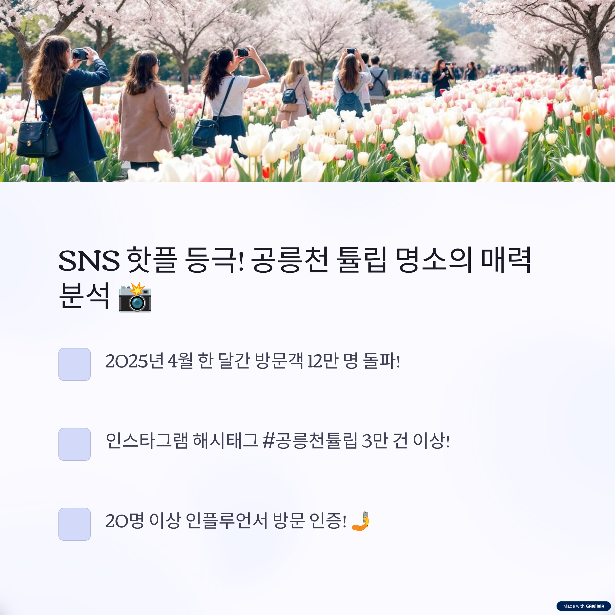 파주 공릉천과 벽초지수목원은 단순한 꽃 명소를 넘어, SNS를 중심으로 입소문을 타며 2025년 봄 핫플레이스로 완전히 자리잡았다. 유럽풍 정원과 함께 감성적인 튤립 포토존, 인플루언서들의 활약, 수도권 근교의 뛰어난 접근성이 결합되며 방문객 수와 지역 경제 효과까지 눈에 띄게 증가하고 있다. 튤립 시즌에는 하루 수천 명이 넘는 인파가 몰리고 있으므로, 방문 전 사전 예약 또는 이른 시간 방문을 추천한다.