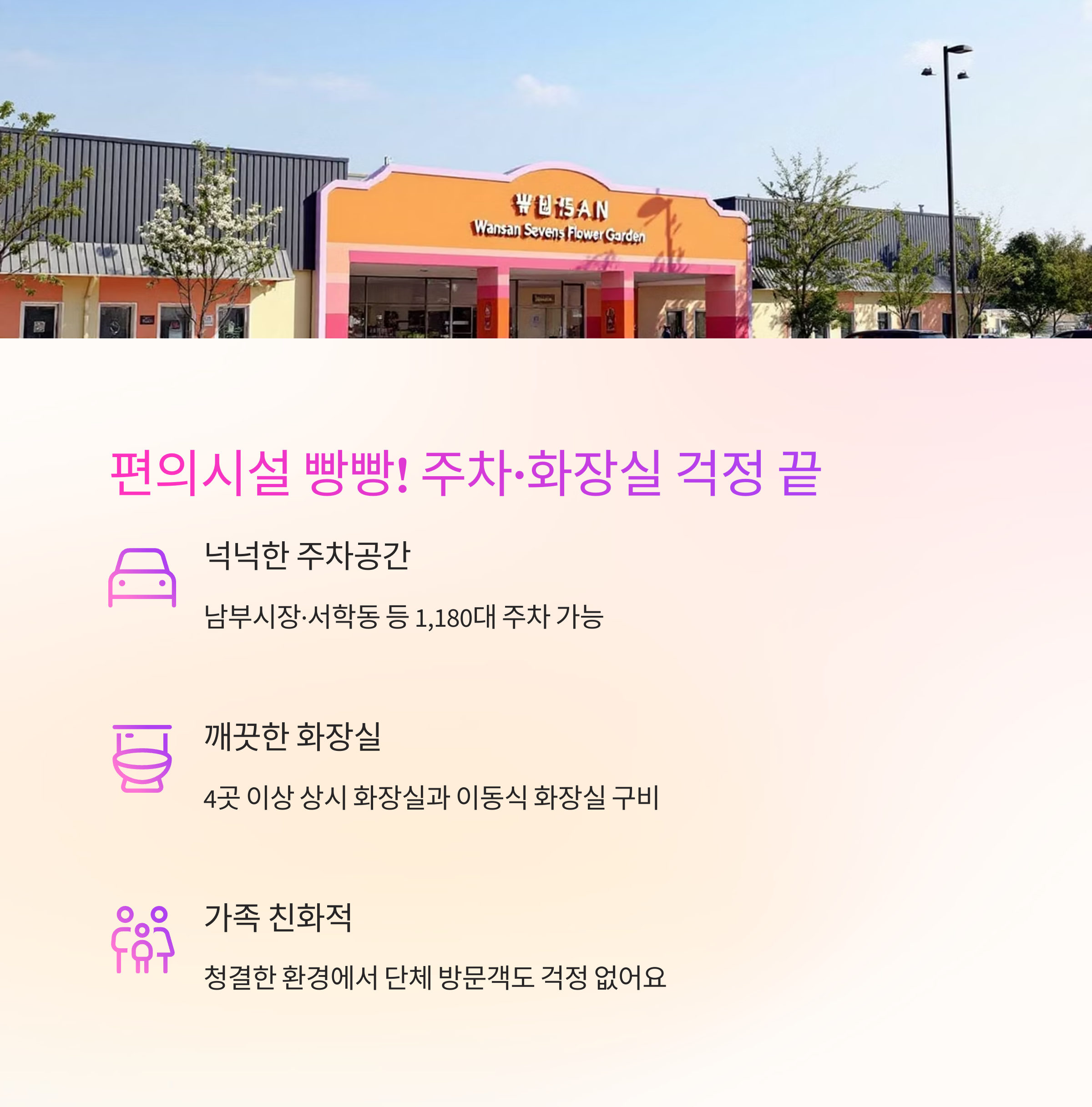 주차 문제나 편의시설 걱정 없이 여행을 즐길 수 있다는 점도 이곳의 장점입니다. 남부시장, 서학동예술마을, 국립무형유산원 등 총 1,180대의 차량이 주차 가능한 공간이 인근에 위치하며, 임시 이동식 화장실과 인근 도서관, 학교 화장실까지 총 4곳 이상의 화장실이 개방되어 여행자에게 쾌적한 환경을 제공합니다. 또한, 매년 4월 초부터 교통 통제가 시행되므로, 이른 아침 방문이나 대중교통 이용이 더욱 편리합니다.