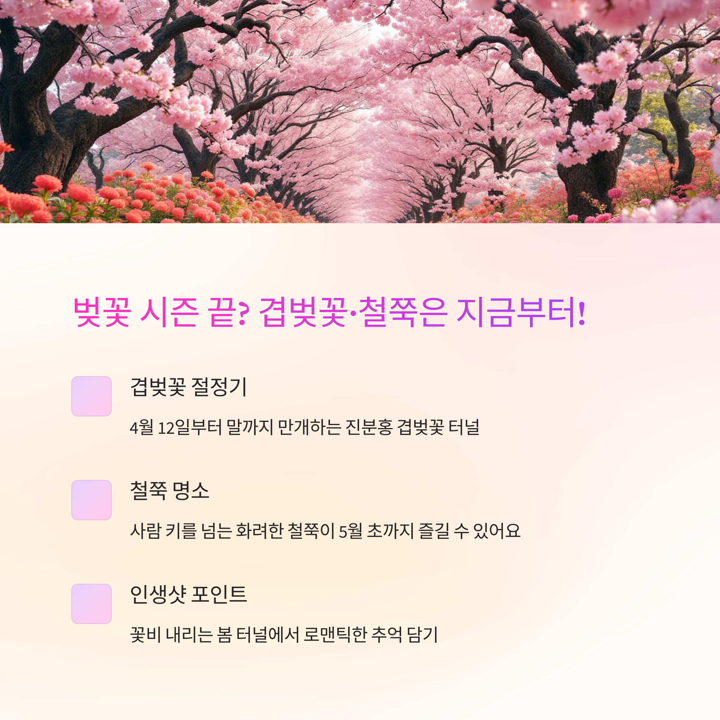 전주 완산칠봉꽃동산에 다녀오신 적 있으신가요? 겹벚꽃 명소 중 최고의 풍경이었다면 어떤 점이 인상 깊었는지, 또는 함께 추천하고 싶은 전주의 다른 장소가 있다면 댓글로 남겨주세요!