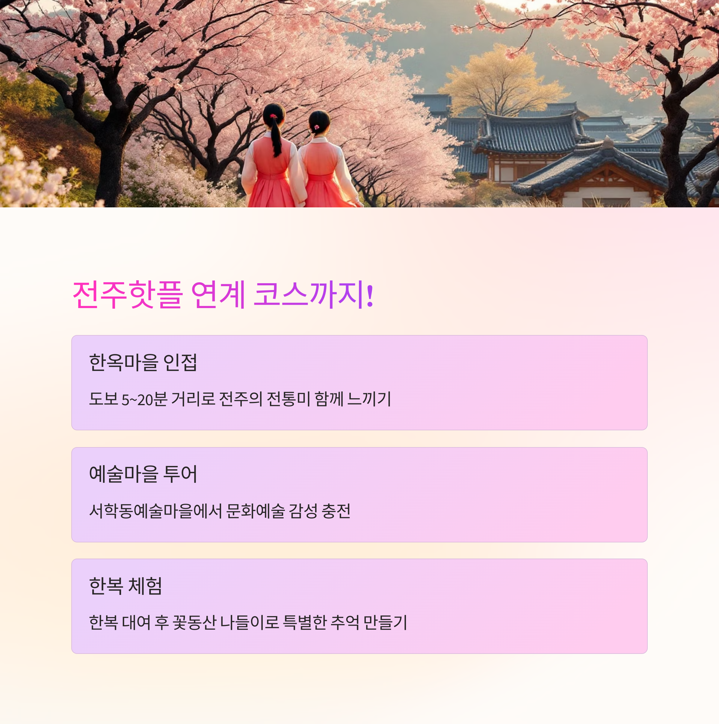 | 4월 12일부터 말까지 만개, 5월 초까지 가능 | 도보, 버스, 택시 등 다양한 접근 수단 가능 | 전주한옥마을, 서학동예술마을, 국립무형유산원 |