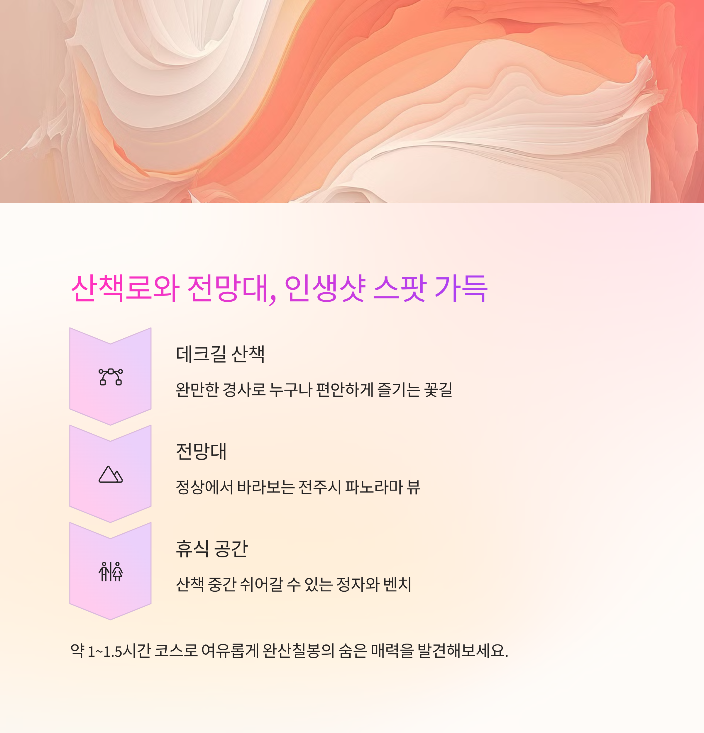 전주 완산칠봉꽃동산은 단순히 봄꽃을 감상하는 장소를 넘어, 자연과 예술, 전통이 어우러진 복합 문화 공간으로 기억될 만한 특별한 여행지입니다. 특히 4월 중순부터 말까지는 겹벚꽃과 철쭉이 동시에 만개하여 환상적인 풍경을 연출하며, 이 시기를 놓친다 해도 5월 초까지 그 아름다움을 충분히 즐길 수 있습니다. 인근 전주한옥마을과 서학동예술마을, 국립무형유산원 등과 연계해 여행 일정을 구성하면 더욱 알찬 봄날을 보낼 수 있으니, 이번 봄엔 꼭 전주로 떠나보시길 추천드립니다.