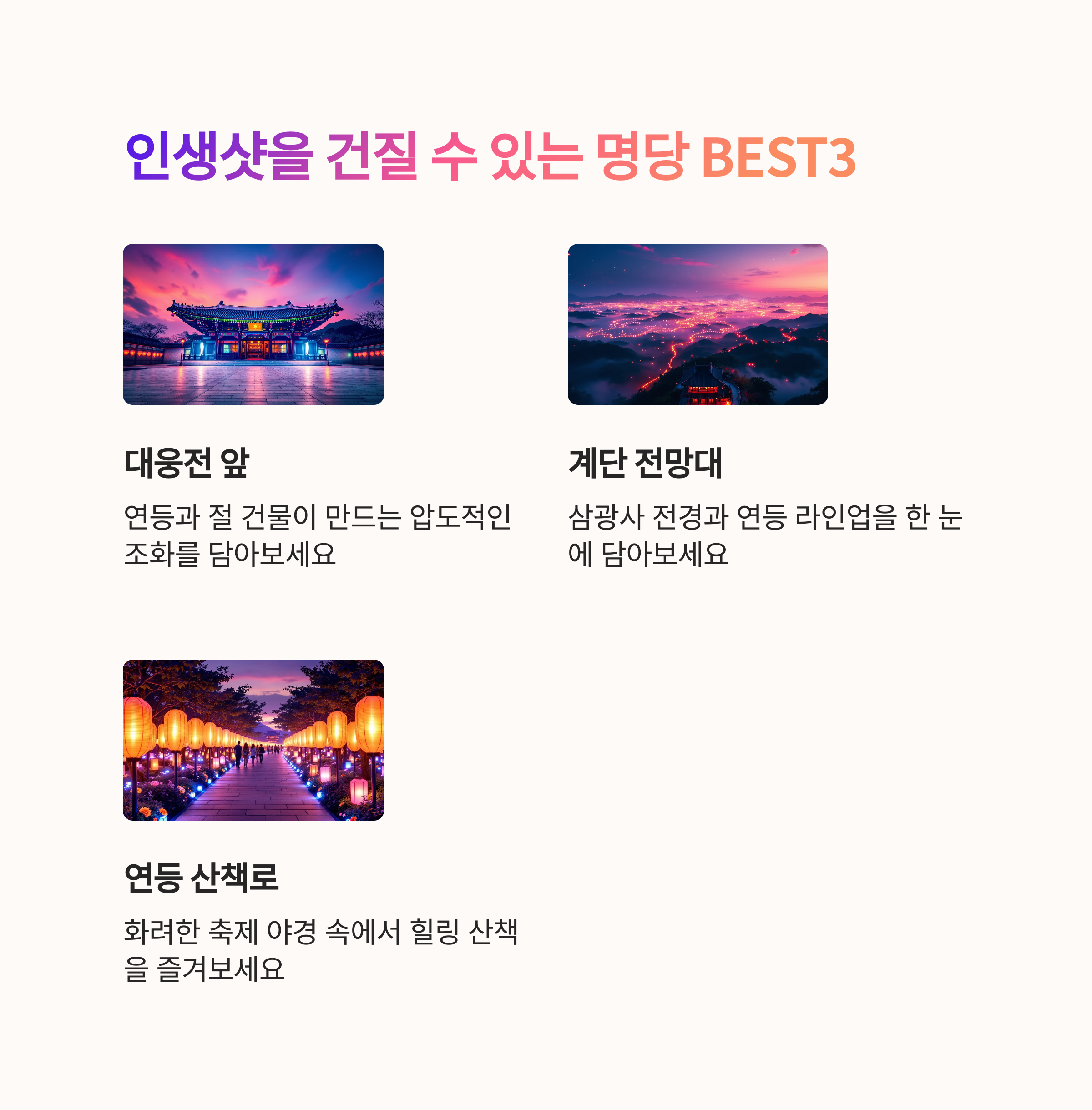 연등축제의 하이라이트는 다양한 인생샷 명소입니다. 대웅전 앞 광장에서 연등 천장 아래 셀카를 찍거나, 계단 위에서 삼광사를 내려다보며 파노라마 풍경을 담는 것도 좋습니다. 사람 없는 조용한 분위기를 원한다면 법당 뒷길 산책로와 연등이 펼쳐진 산책길을 추천합니다. 특히 해 질 무렵에 도착해 일몰과 함께 연등이 켜지는 순간을 경험하면, 그 감동은 두 배가 됩니다. 삼각대와 야간 모드는 필수 준비물이며, 배터리 여분도 챙기는 것이 좋습니다.