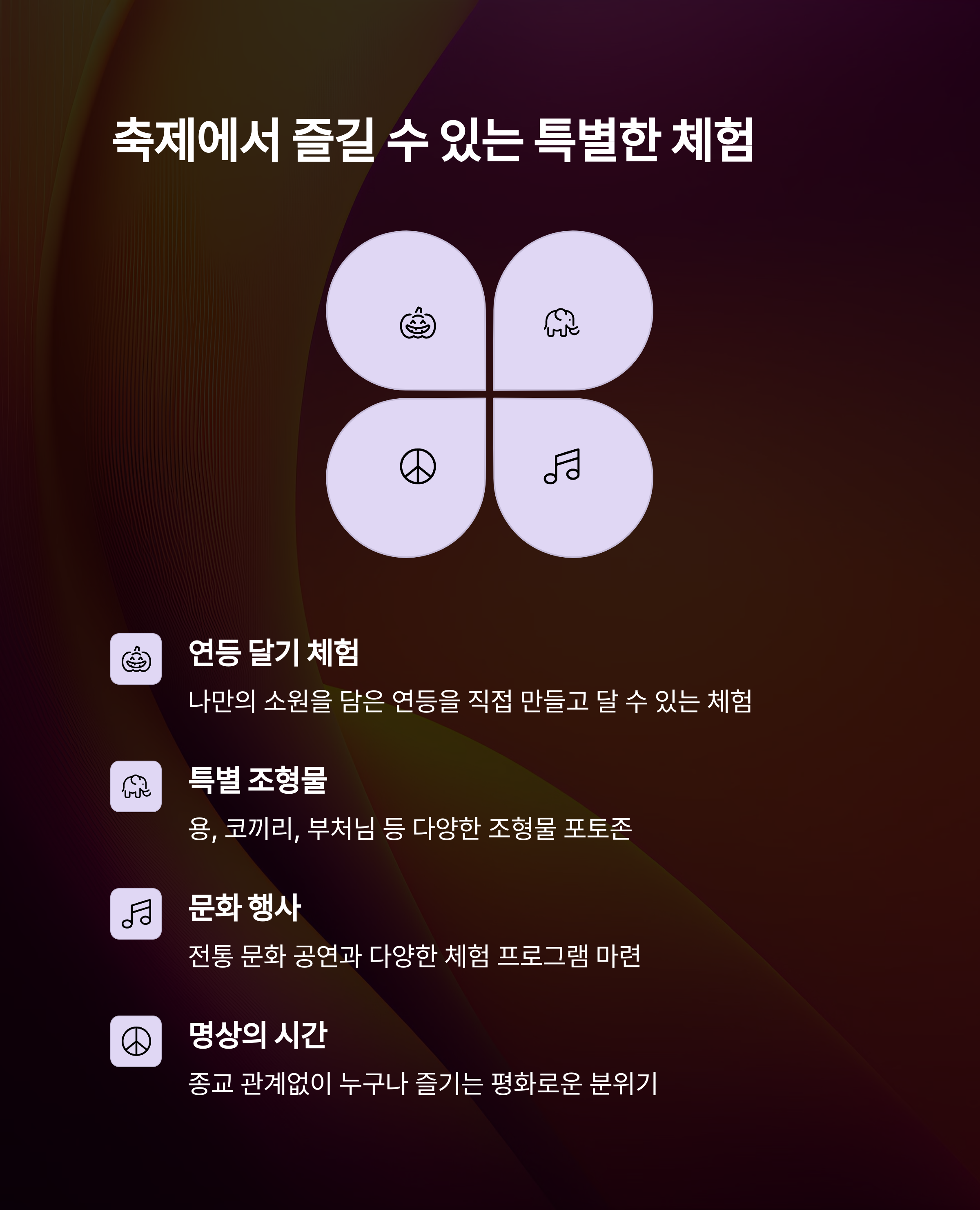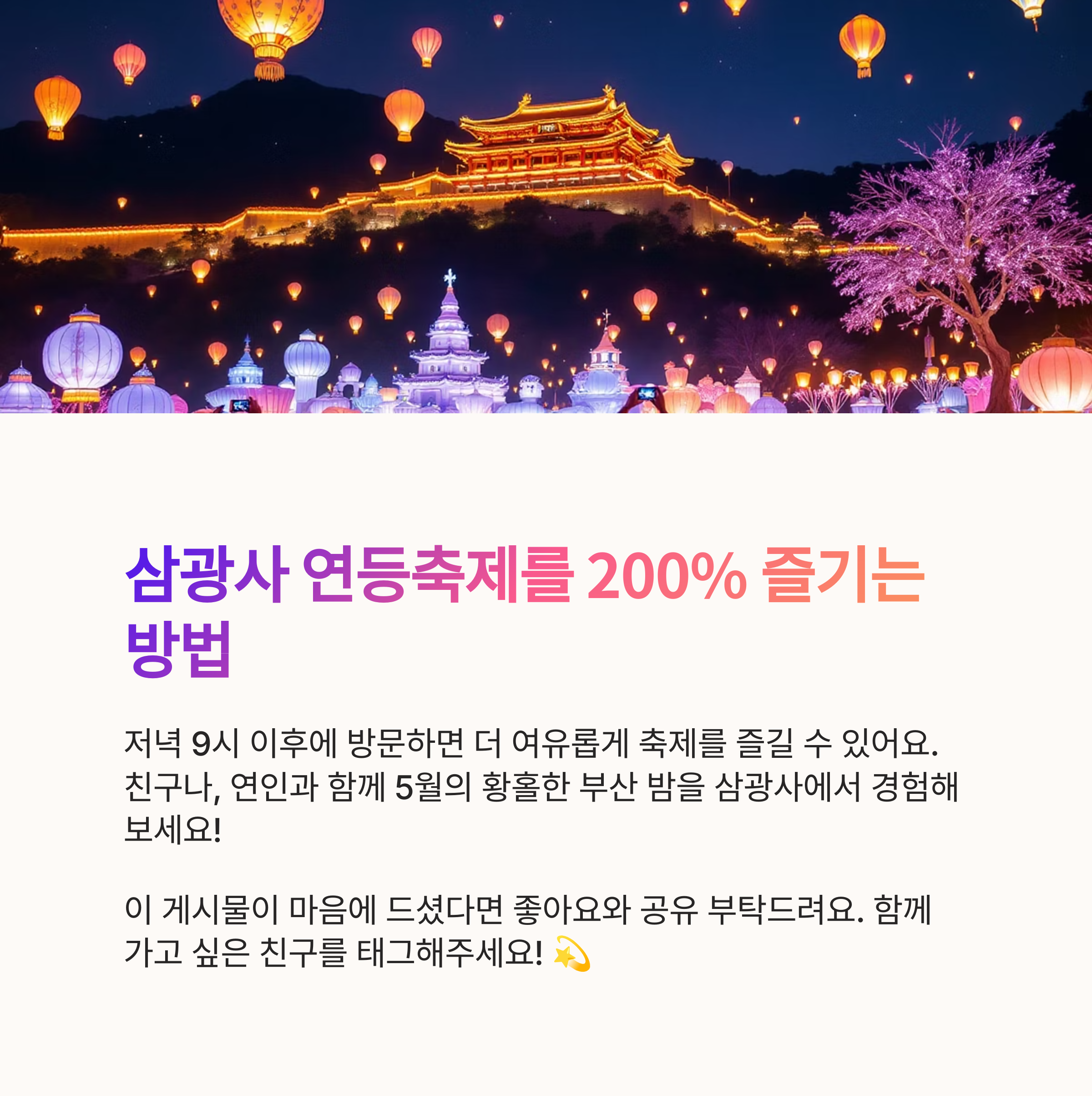 부산 삼광사 연등축제는 불교적 전통과 예술적 감성이 어우러진 아름다운 문화 행사로, 봄밤의 기억을 더욱 특별하게 만들어줍니다. 연등이 만들어내는 빛의 터널과 색감은 직접 보지 않고는 설명하기 힘든 감동을 전하며, 가족, 연인, 친구 누구와 함께해도 좋은 추억을 남길 수 있습니다.