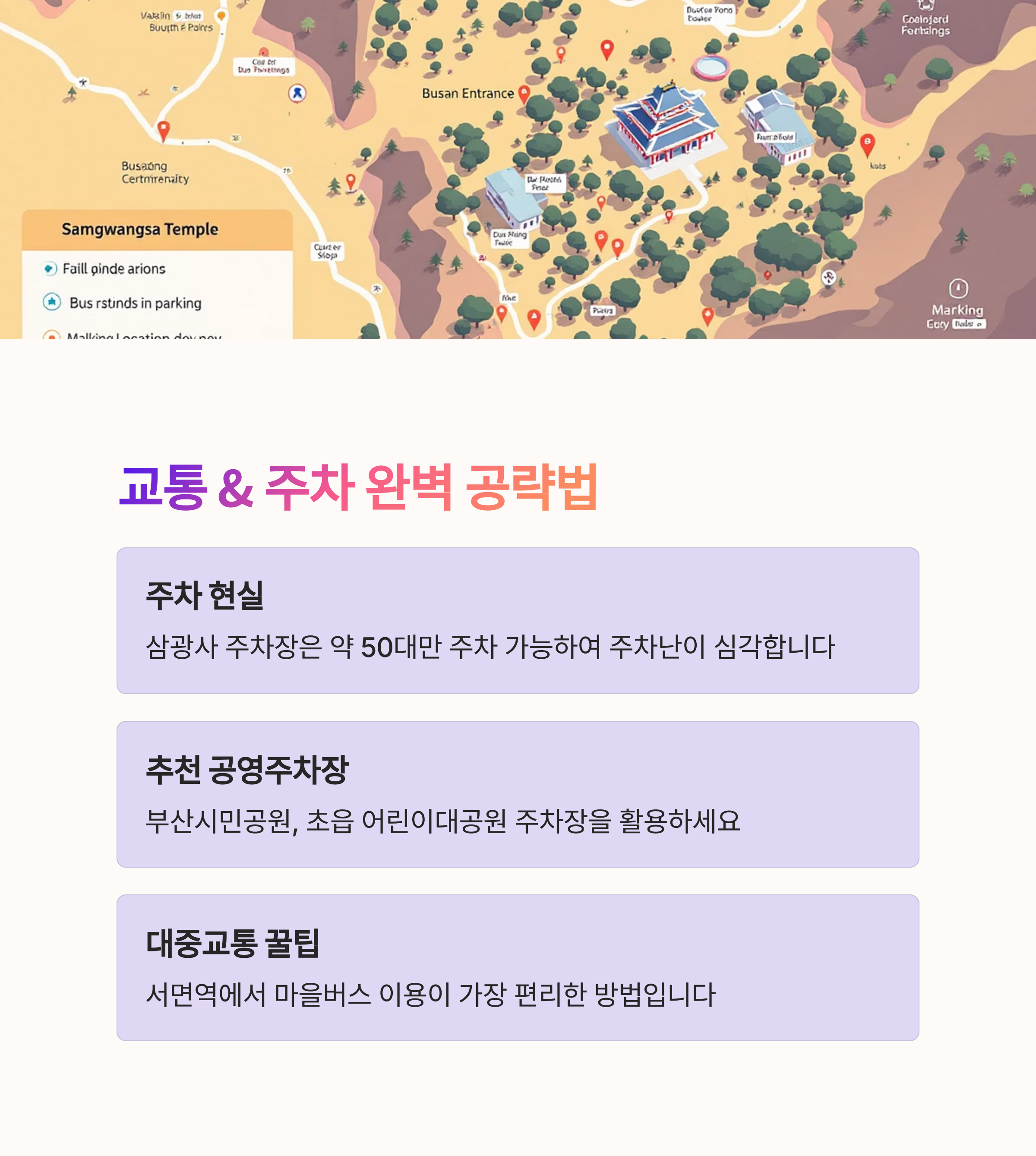 | 주차 및 교통 | 삼광사 주차 협소, 시민공원/대공원 추천, 대중교통 적극 활용 |