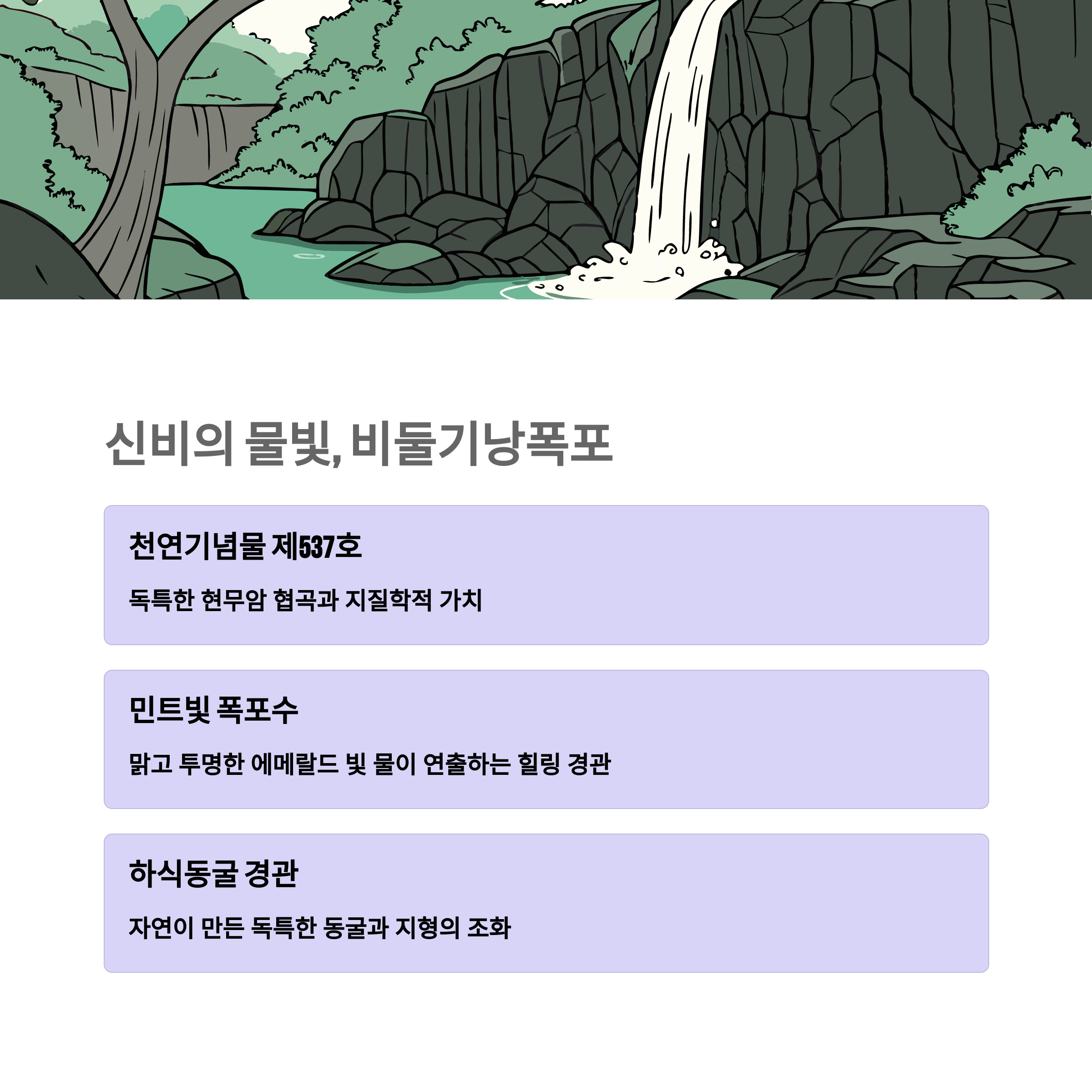 | 총 길이 410m, 세 방향으로 나뉘는 국내 유일 구조 | 천연기념물 제537호, 민트빛 폭포, 드라마 촬영지 | 지질해설, 꽃정원, 전기자전거 체험, 미디어아트 예정 |