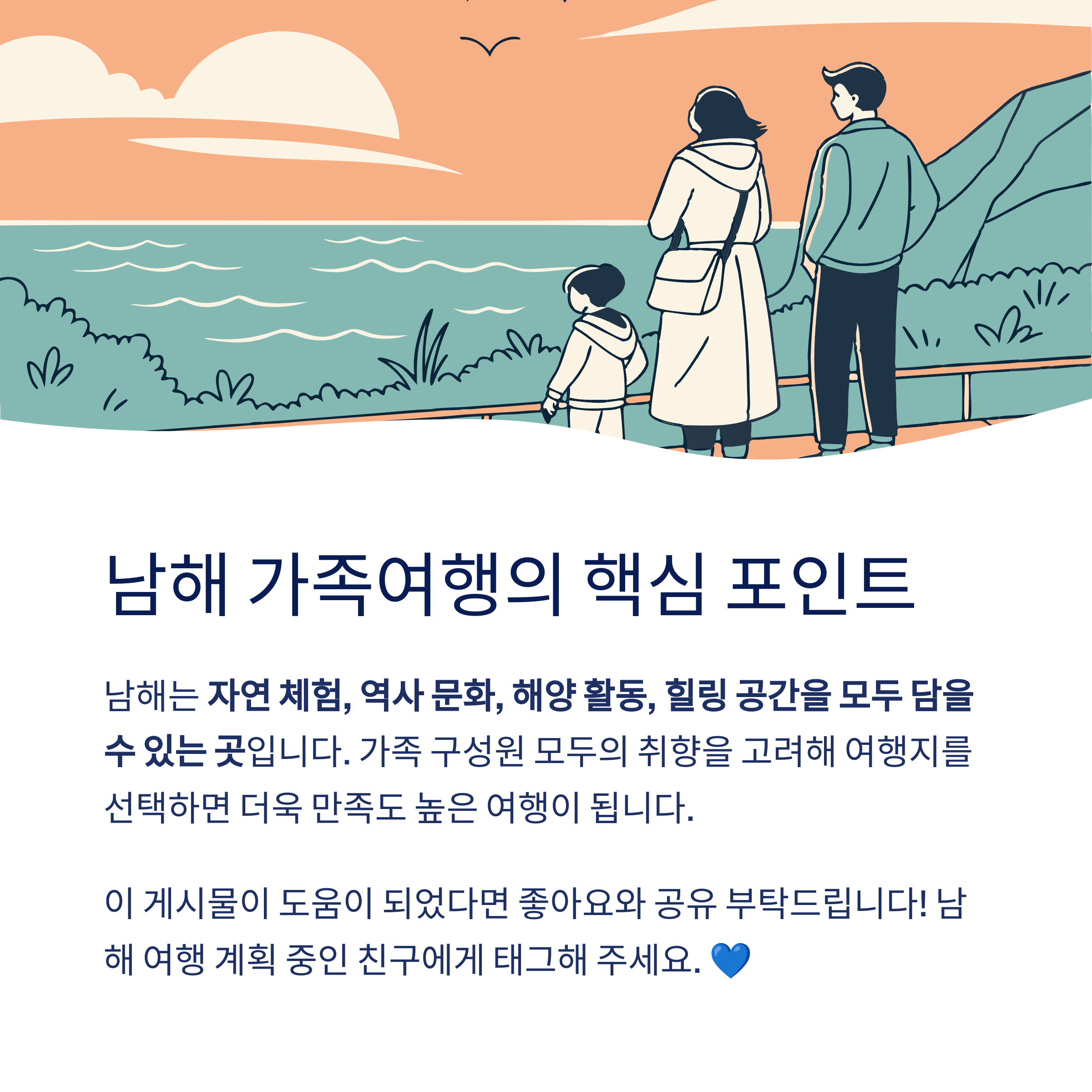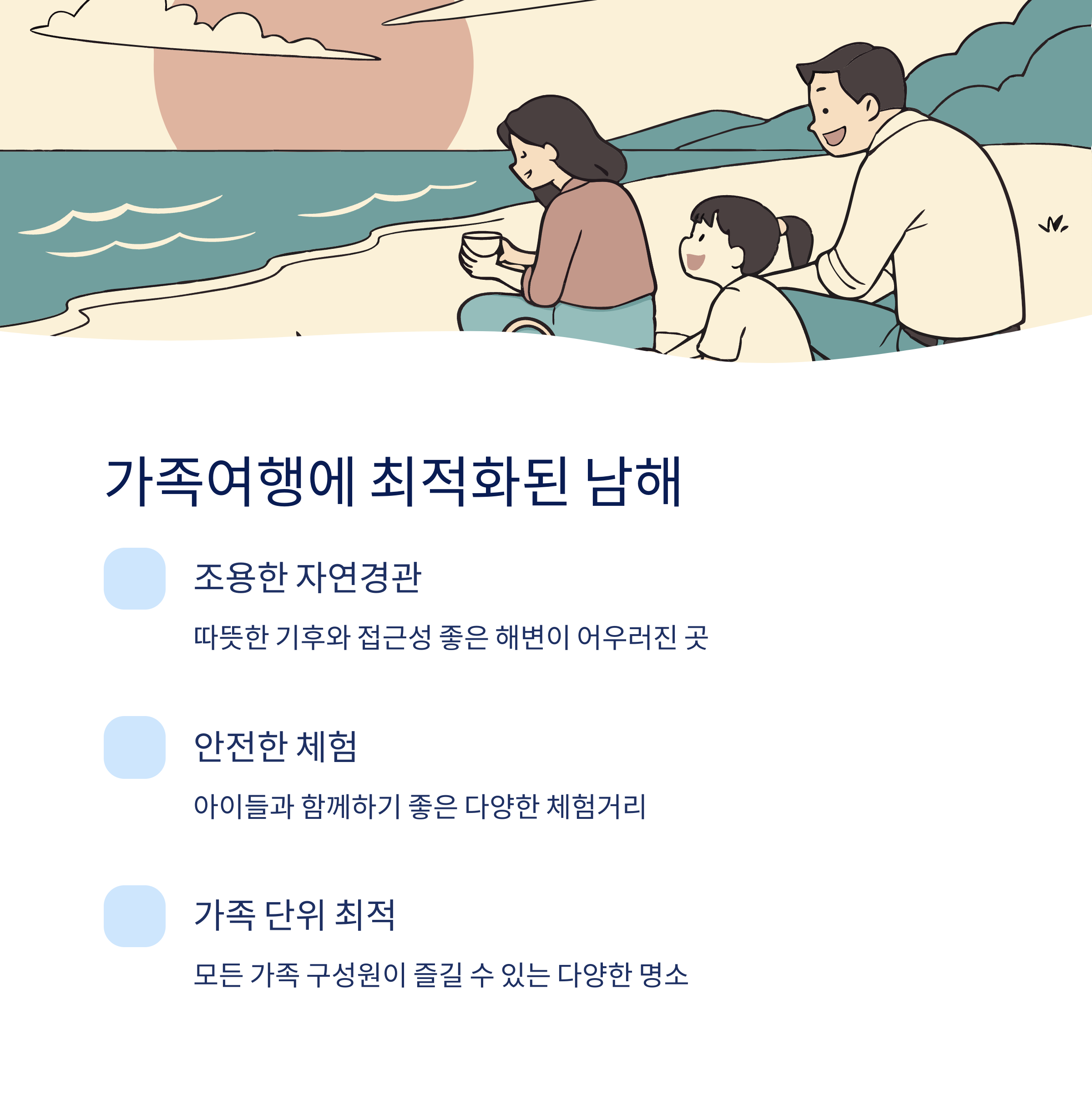 자연 체험, 역사 문화, 해양 활동, 힐링 공간을 모두 담을 수 있는 남해에서 가족과 특별한 시간을 만들어보시기 바랍니다.