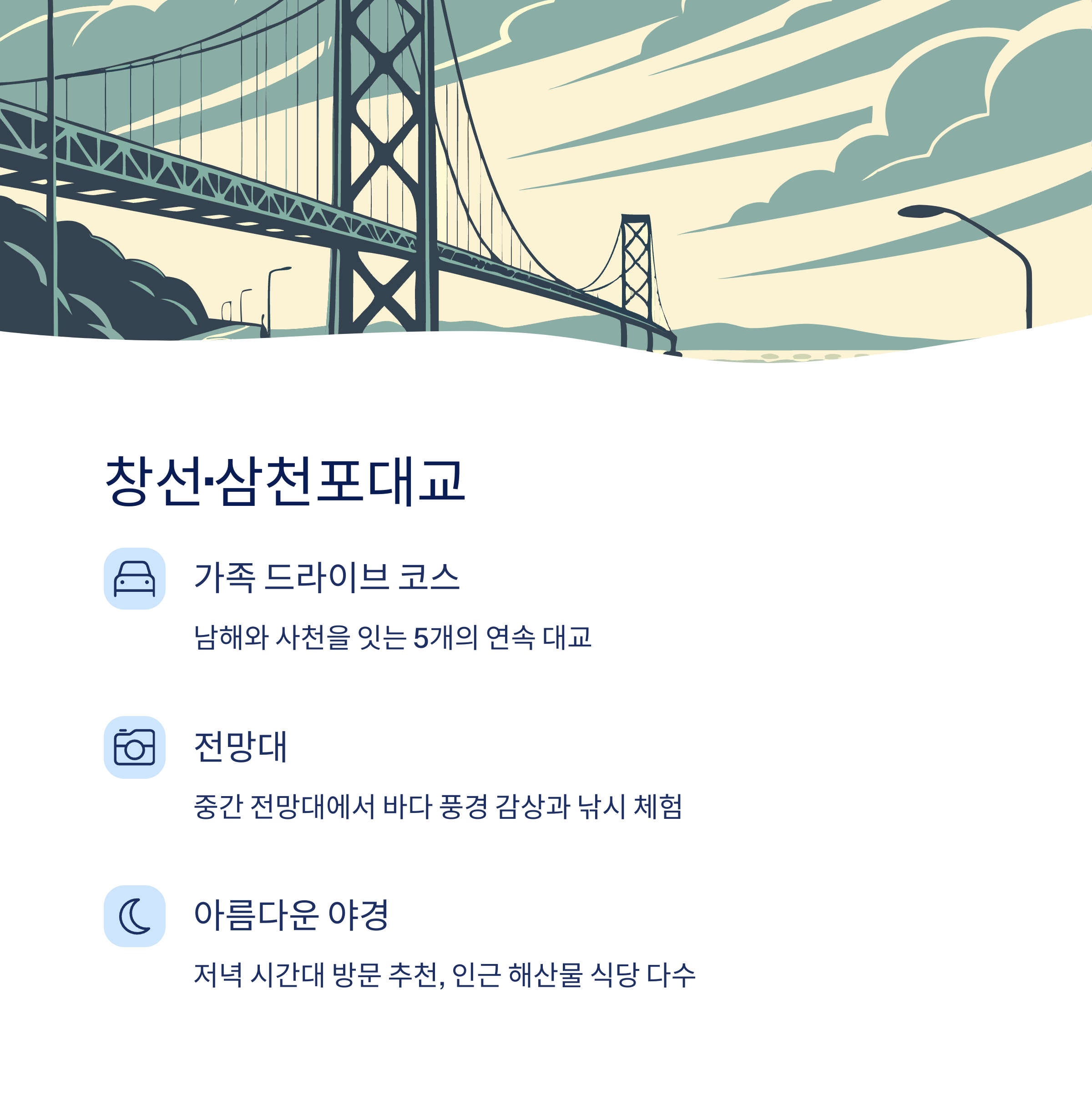 창선·삼천포대교는 남해와 사천을 잇는 5개의 연속 대교로, 가족 드라이브 코스로 인기가 많습니다.
