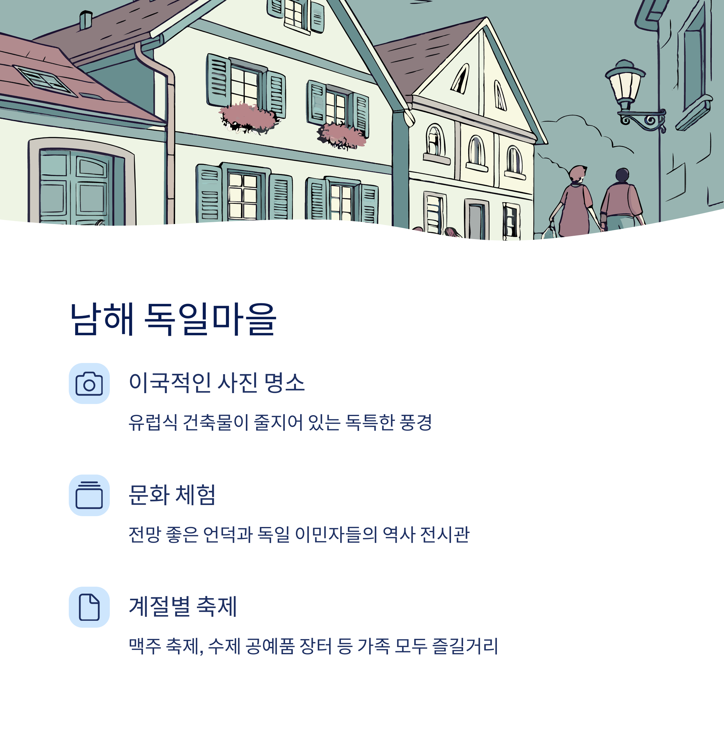 남해 독일마을은 독특한 유럽식 건축물이 줄지어 있어, 가족 단위 방문객에게 이국적인 배경을 제공합니다.