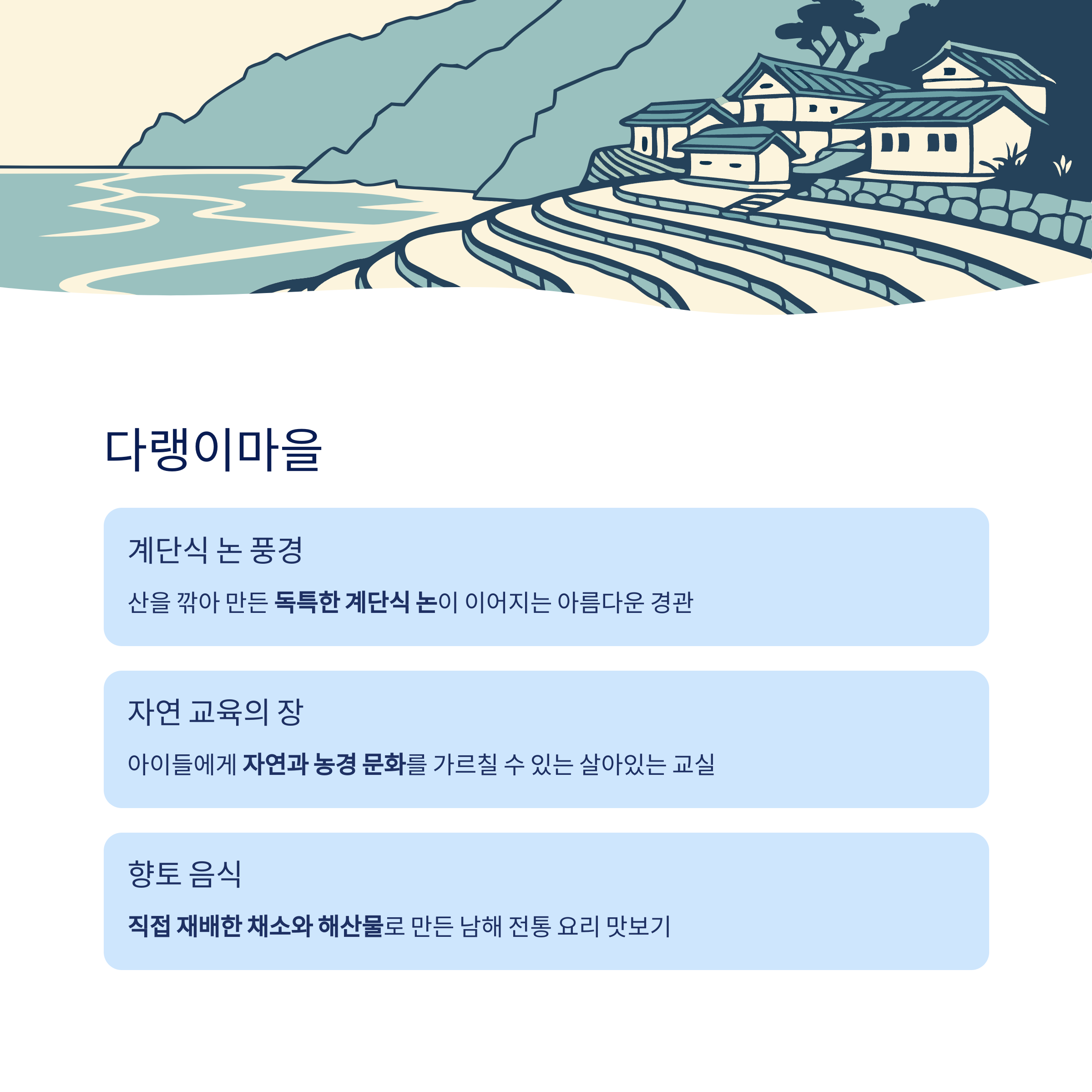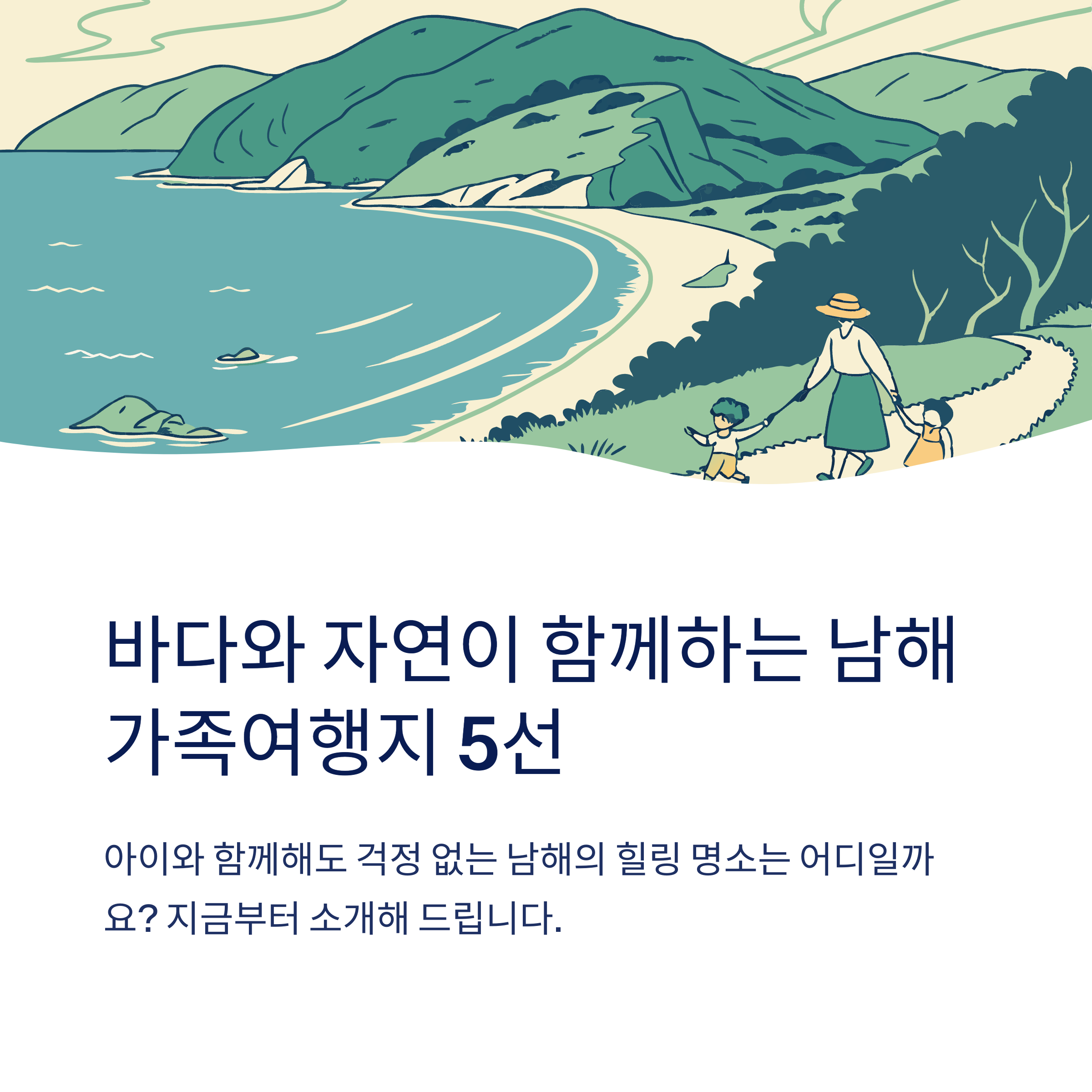 남해는 다양한 자연 환경과 휴식, 체험 요소를 동시에 갖춘 곳입니다.