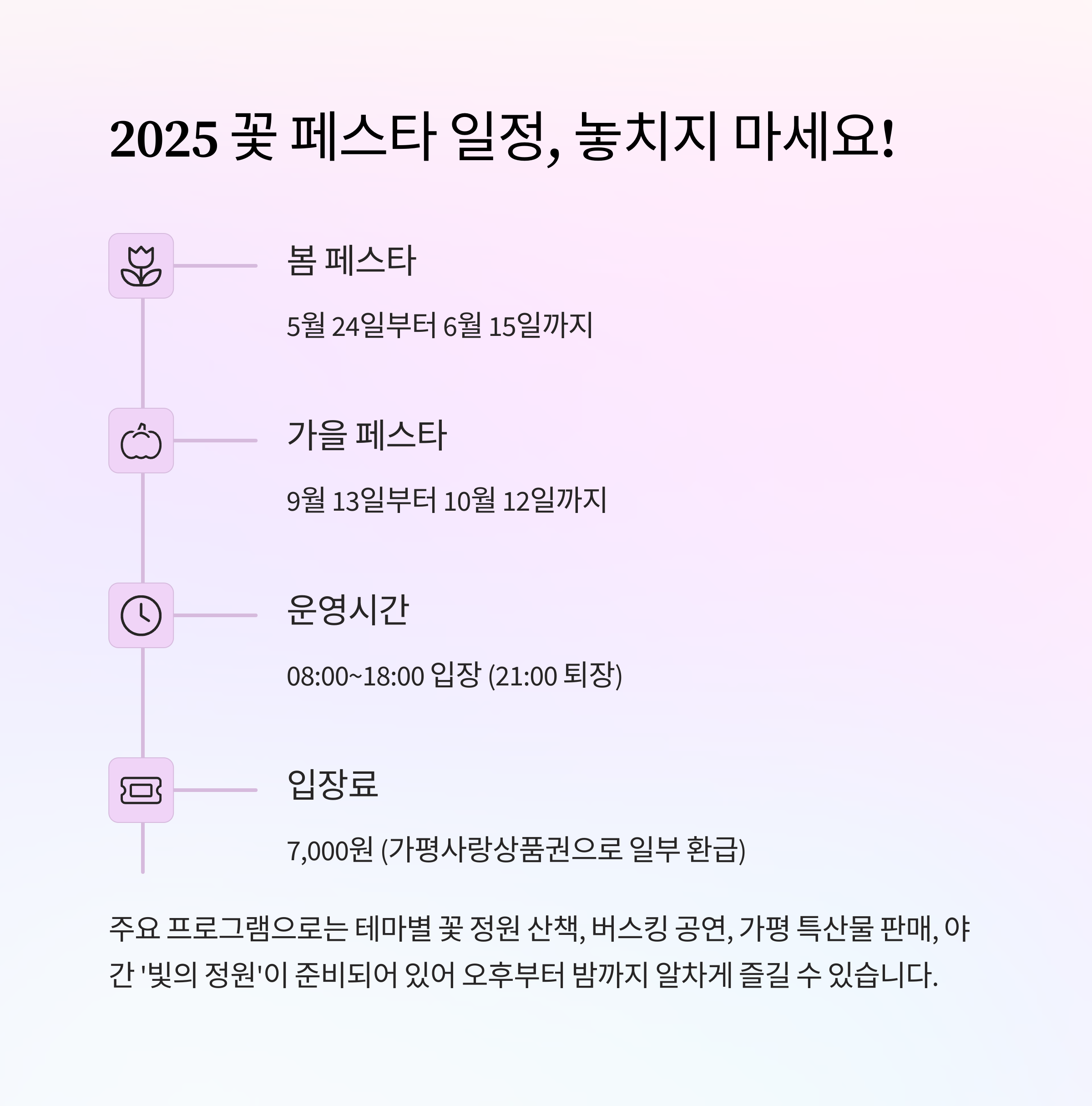 | 구분 | 일정 | 운영시간 | 입장료 | 주요 볼거리 |