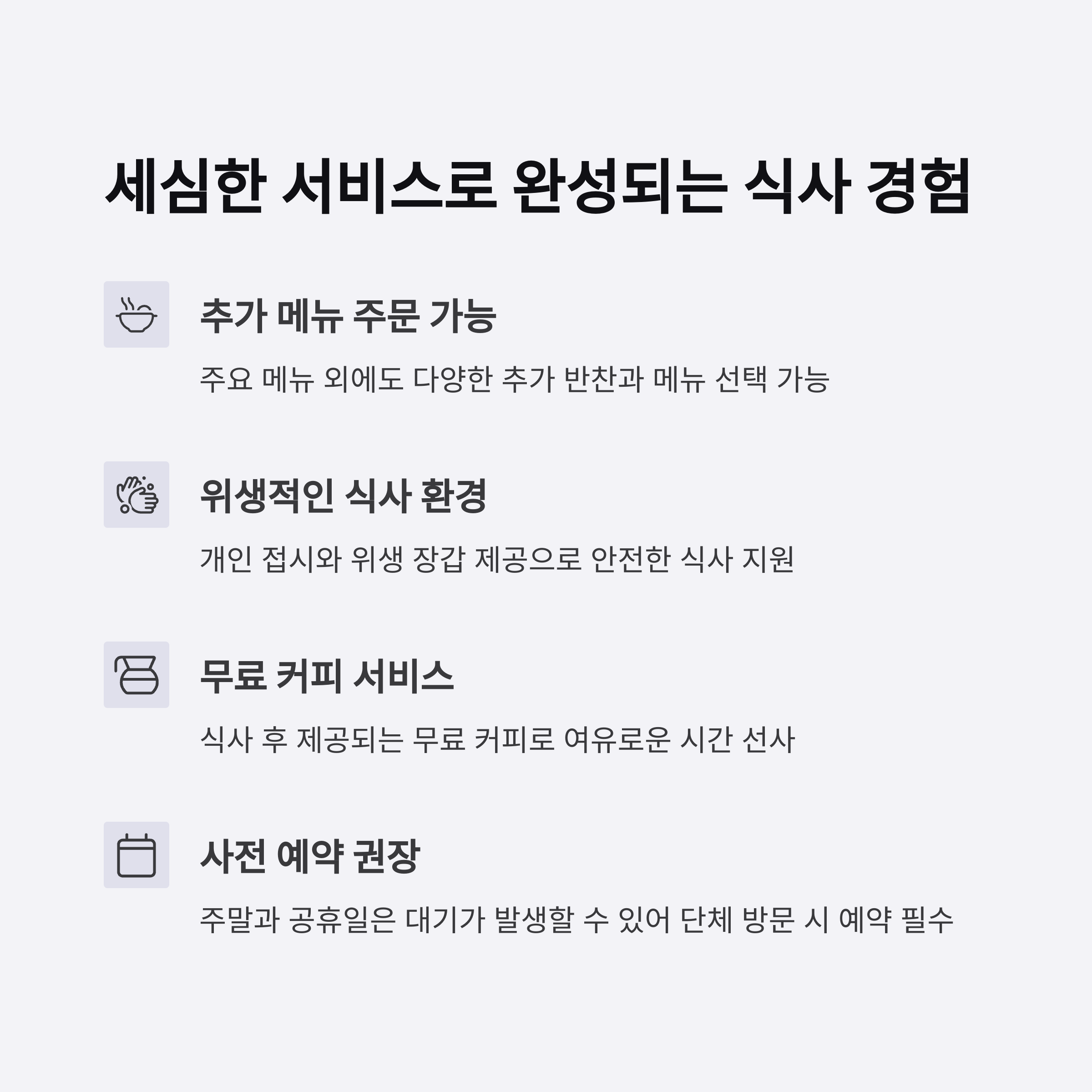 추가 반찬과 메뉴를 주문할 수 있습니다.