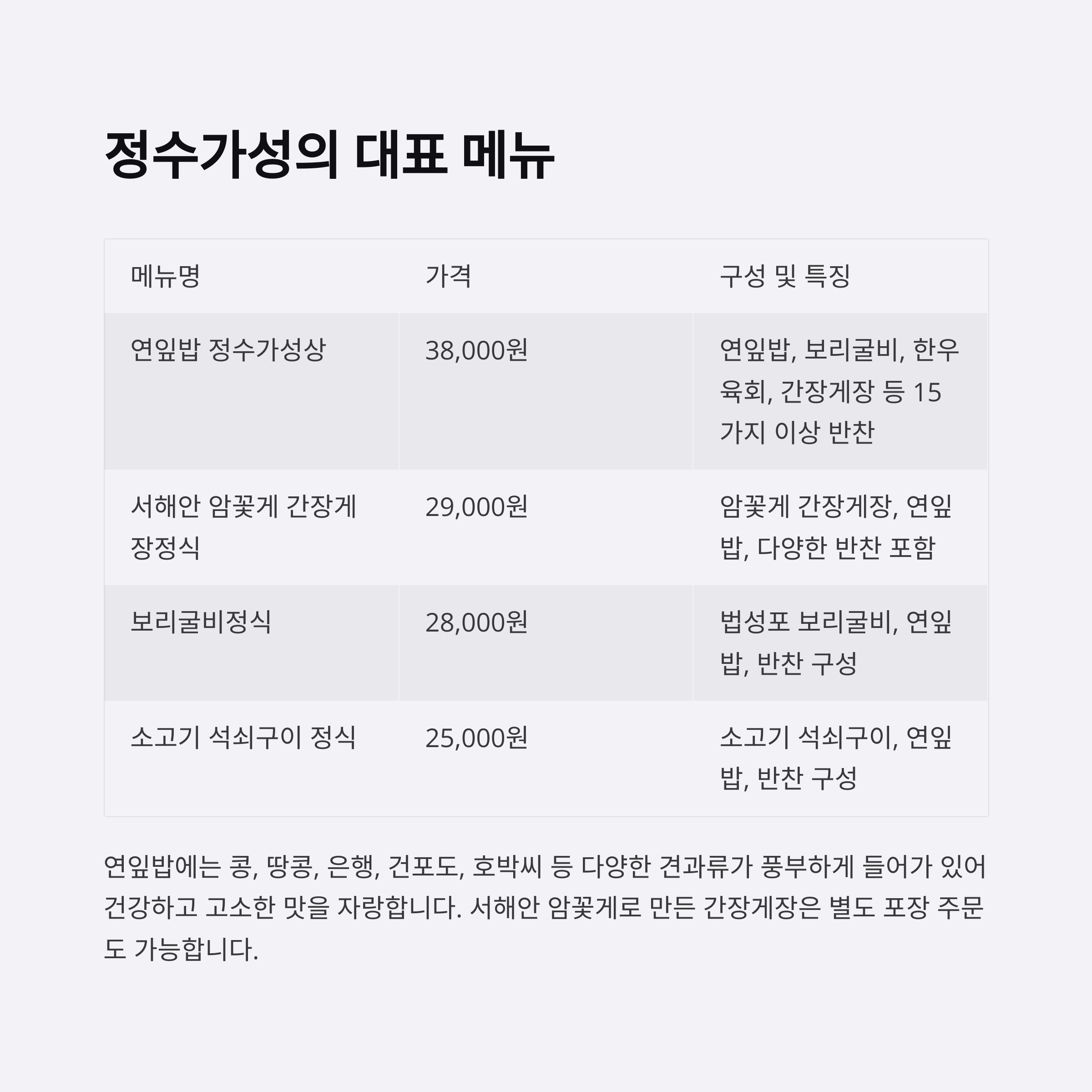 | 연잎밥 정수가성상 | 38,000원 | 연잎밥, 보리굴비, 한우육회, 간장게장 등 15가지 이상 반찬 |