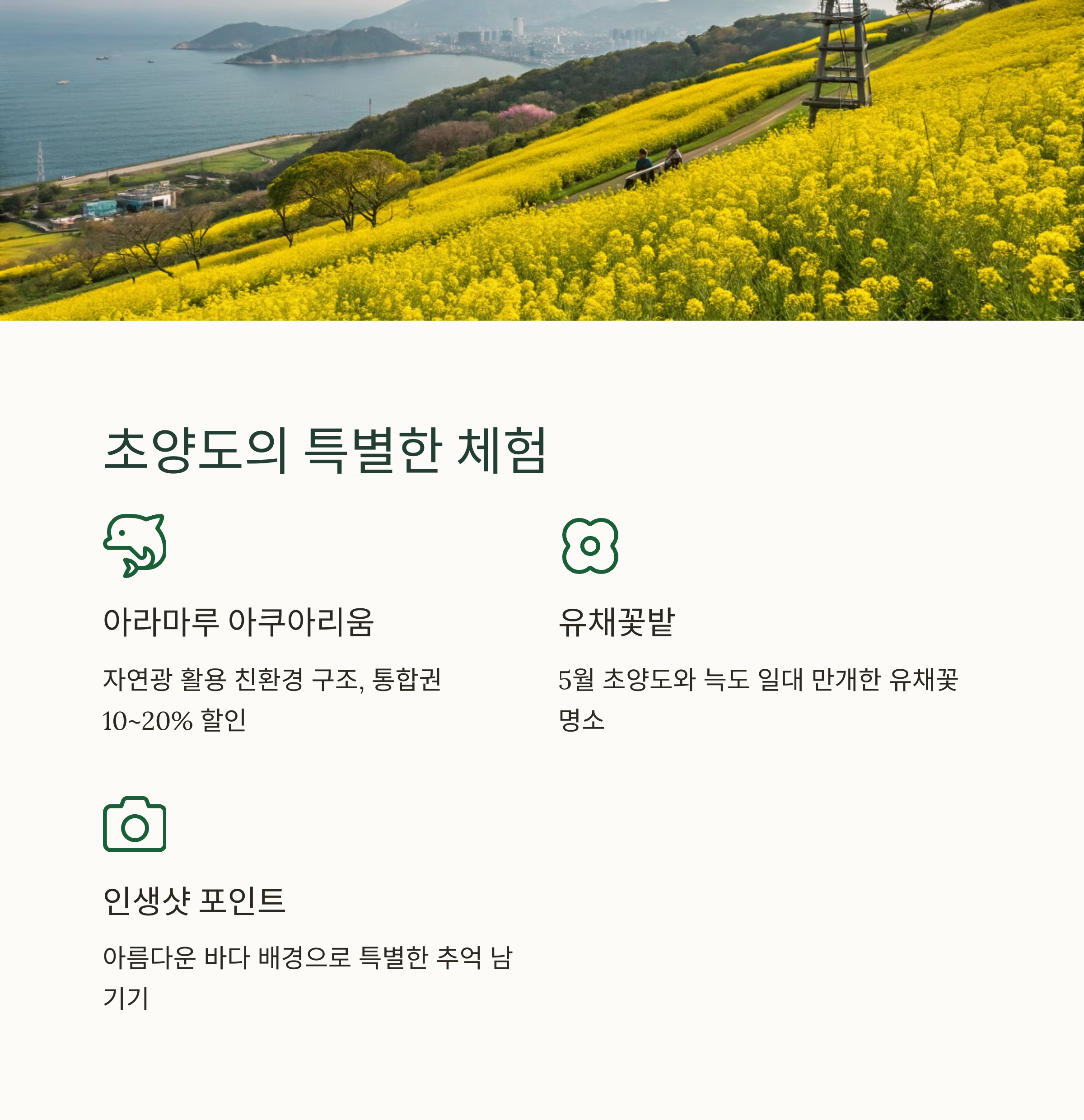 | 초양 | 아쿠아리움, 체험시설 | 유채꽃밭, 체험 프로그램 |