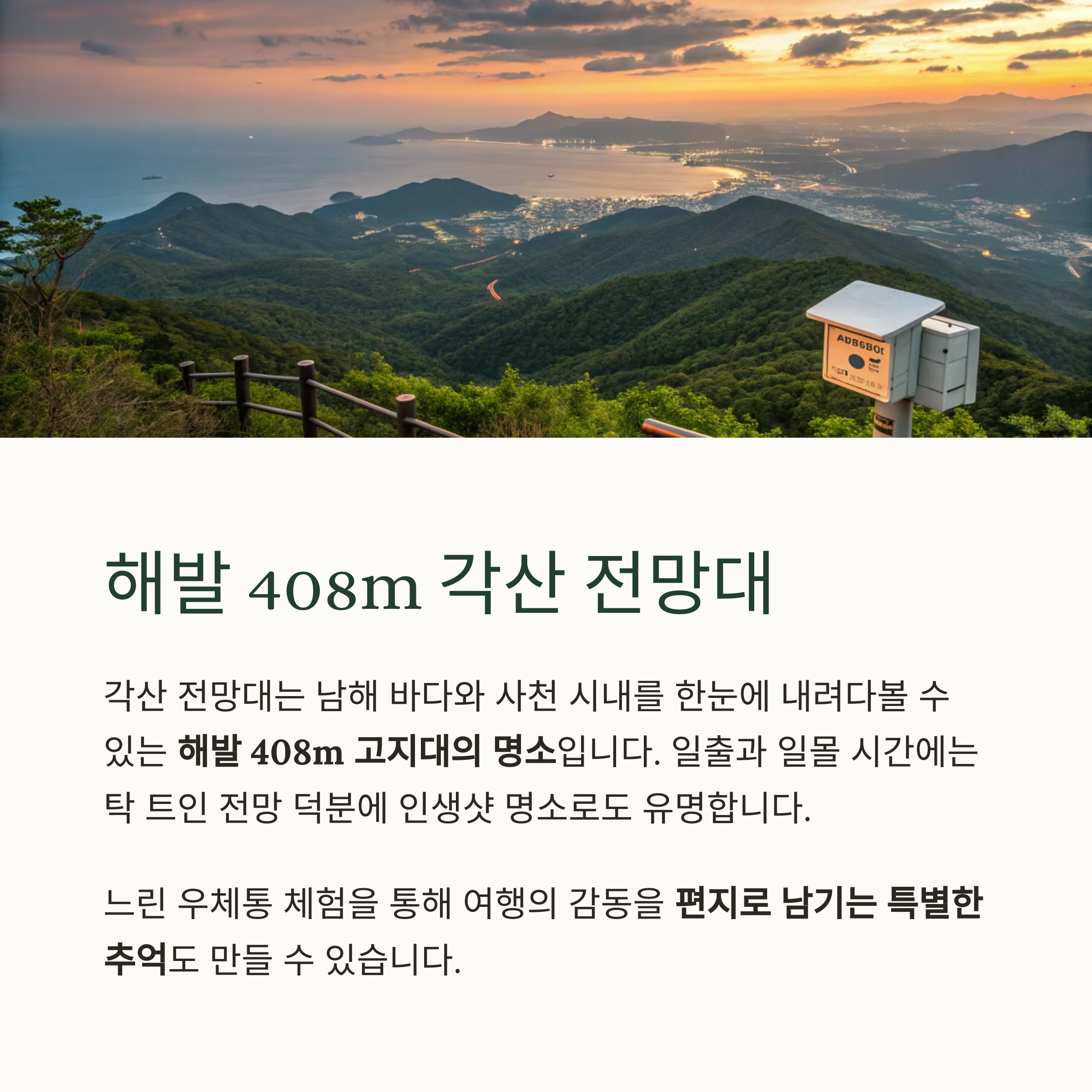 | 각산 | 전망대 | 일출·일몰 감상, 느린 우체통 |
